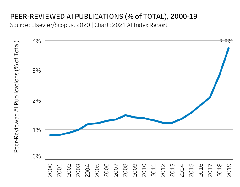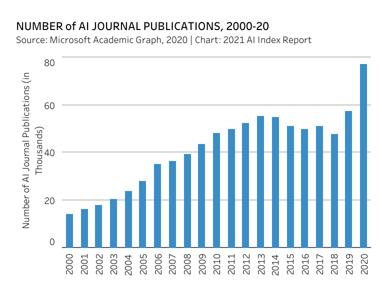 R&D is fundamental to AI progress. Since the technology first captured the imagination of computer scientists and mathematicians in the 1950s, AI has grown into a major research discipline with significant commercial applications. The number of AI publications has increased dramatically in the past 20 years. The rise of AI conferences and preprint archives has expanded the dissemination of research and scholarly communications. Major powers, including China, the European Union, and the United States, are racing to invest in AI research. The R&D chapter aims to capture the progress in this increasingly complex and competitive field.
