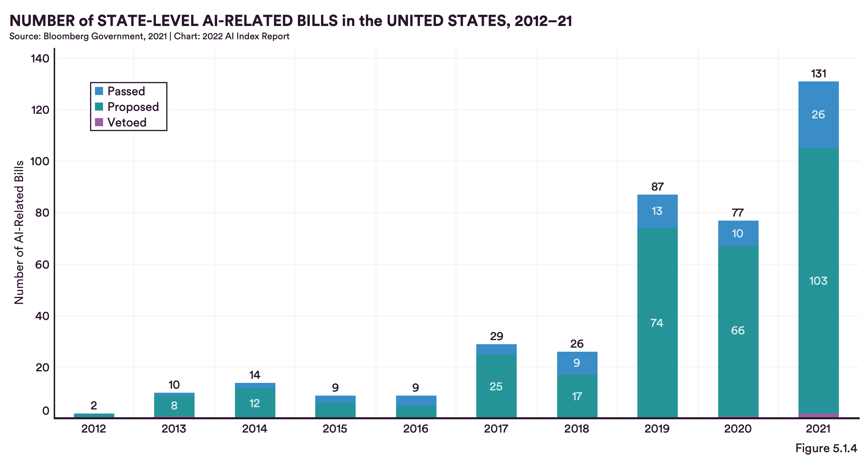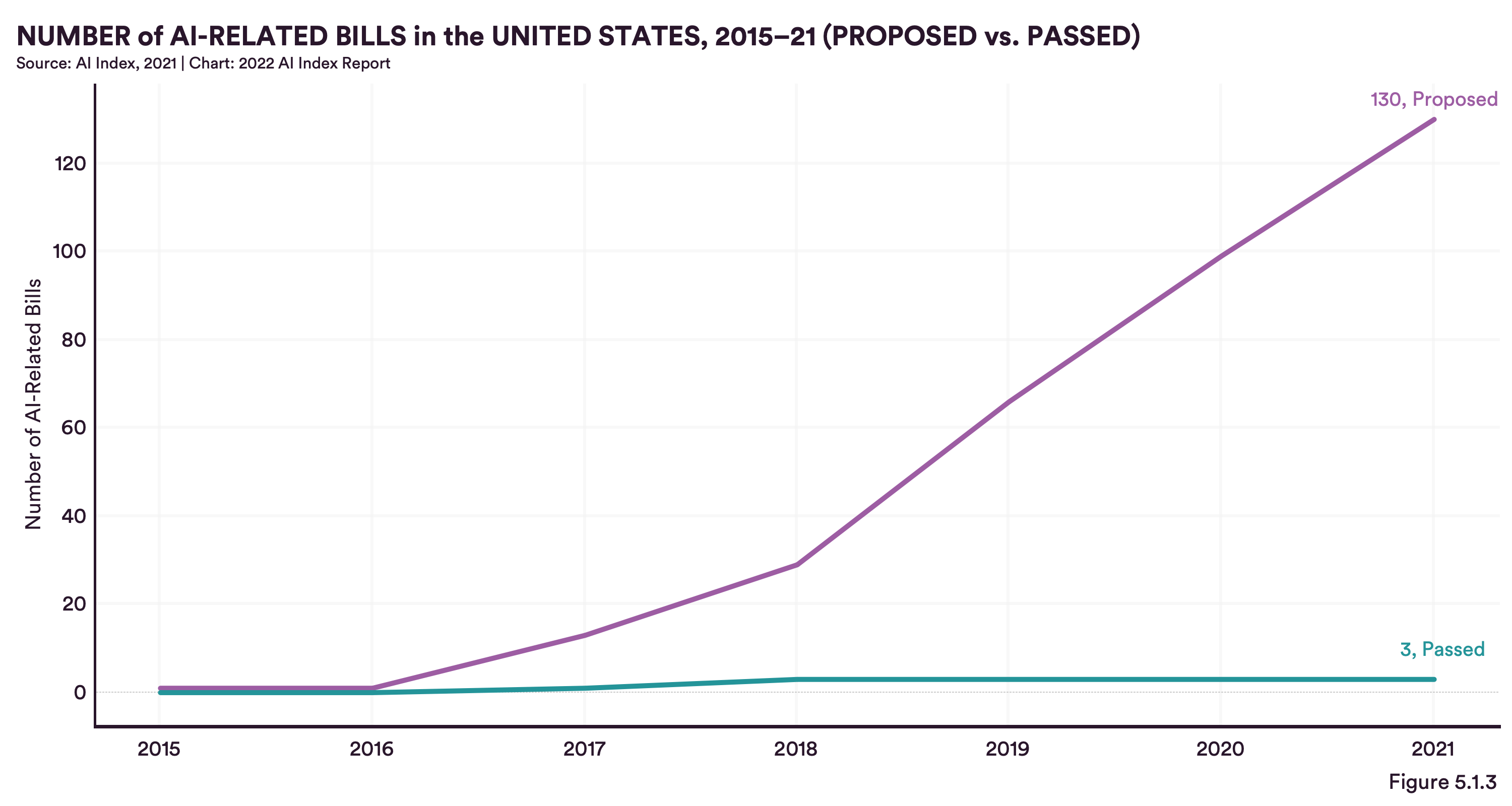 Number of AI-related bills in the United States, 2015-21 (proposed vs. passed).