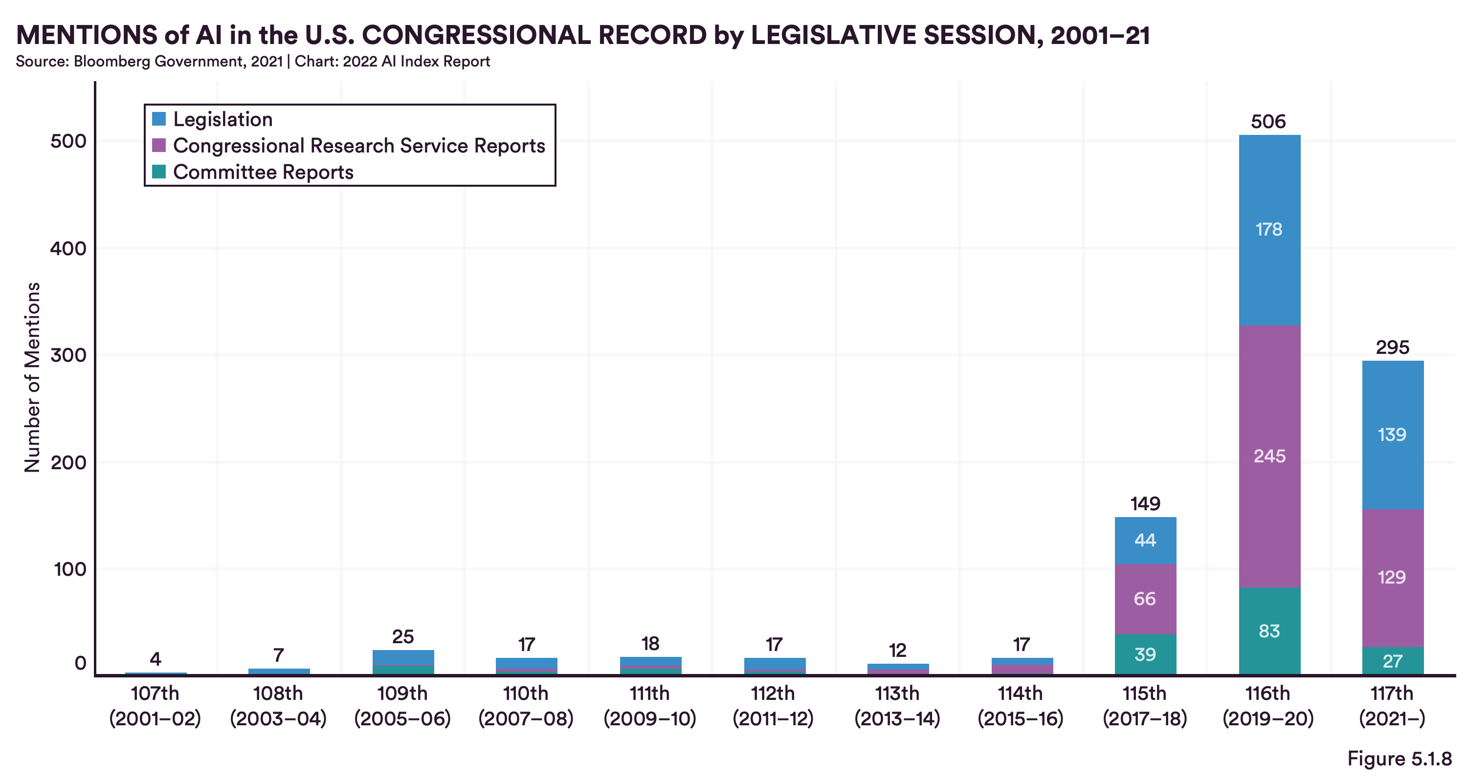 Mentions of AI in the U.S. congressional record by legislative session, 2001-21.