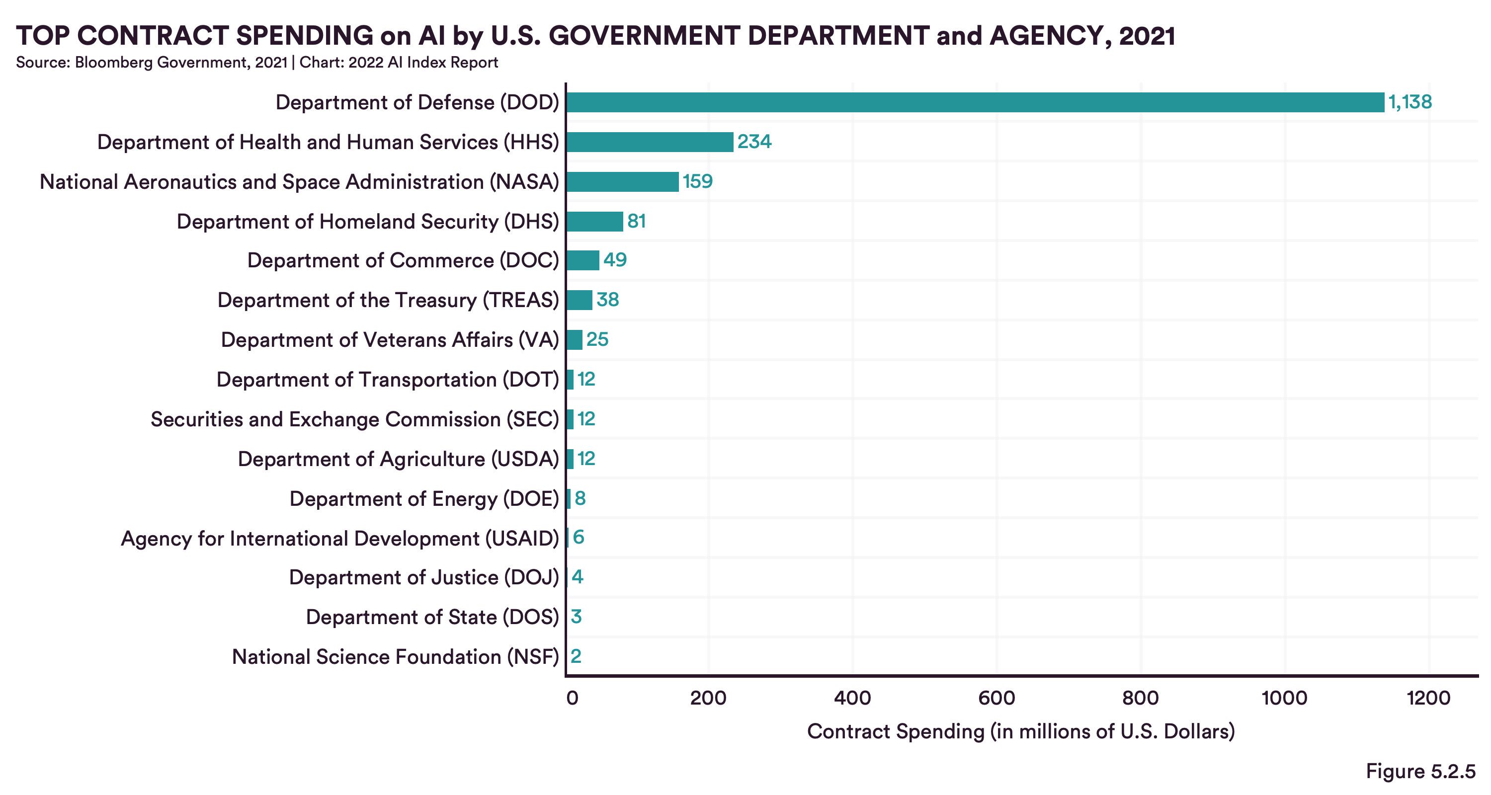 Top Contract spending on AI by U.S. government department and agency, 2021.