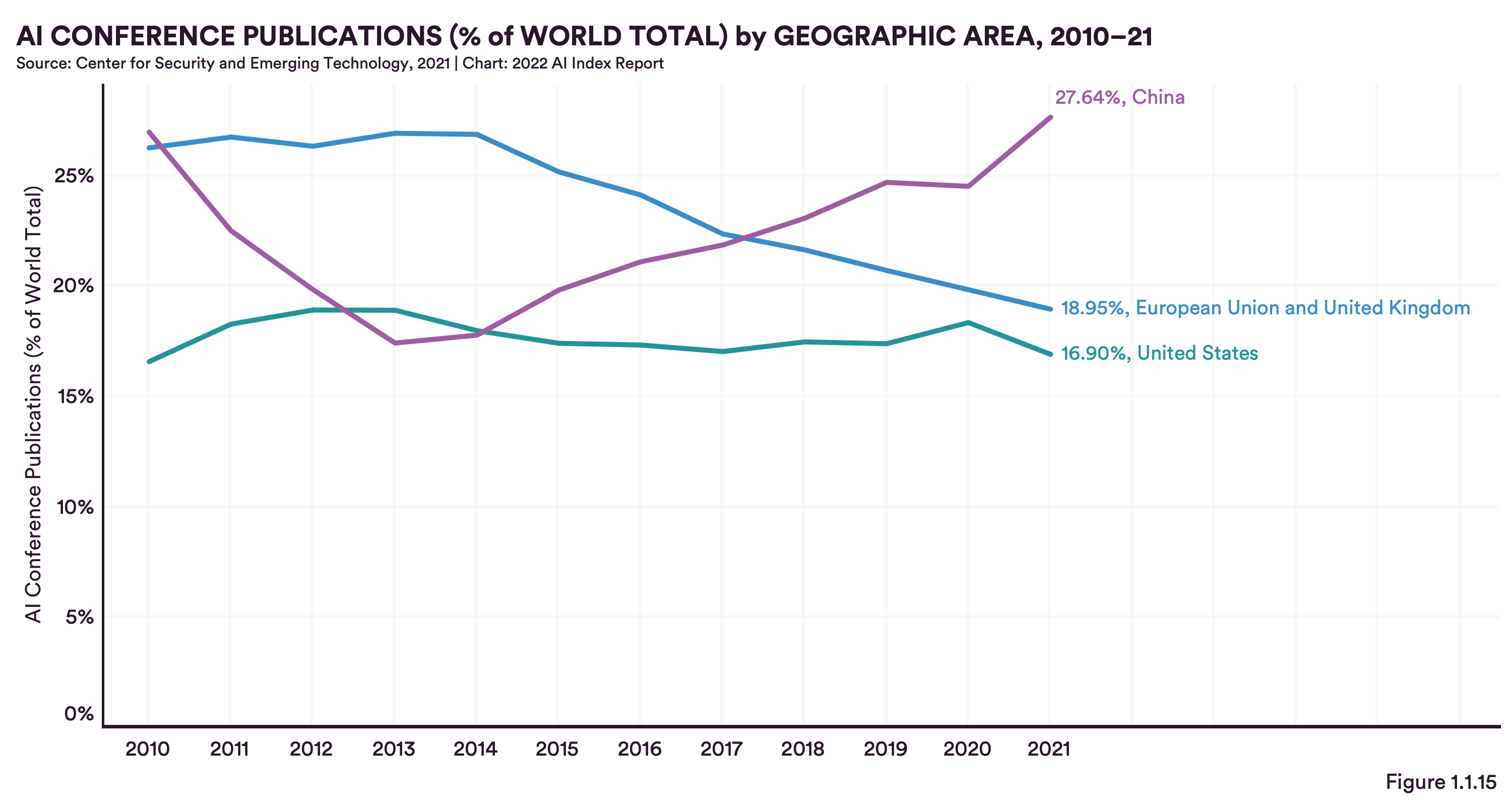 AI conference publications (% of the world total) by geographic area, 2010-21.