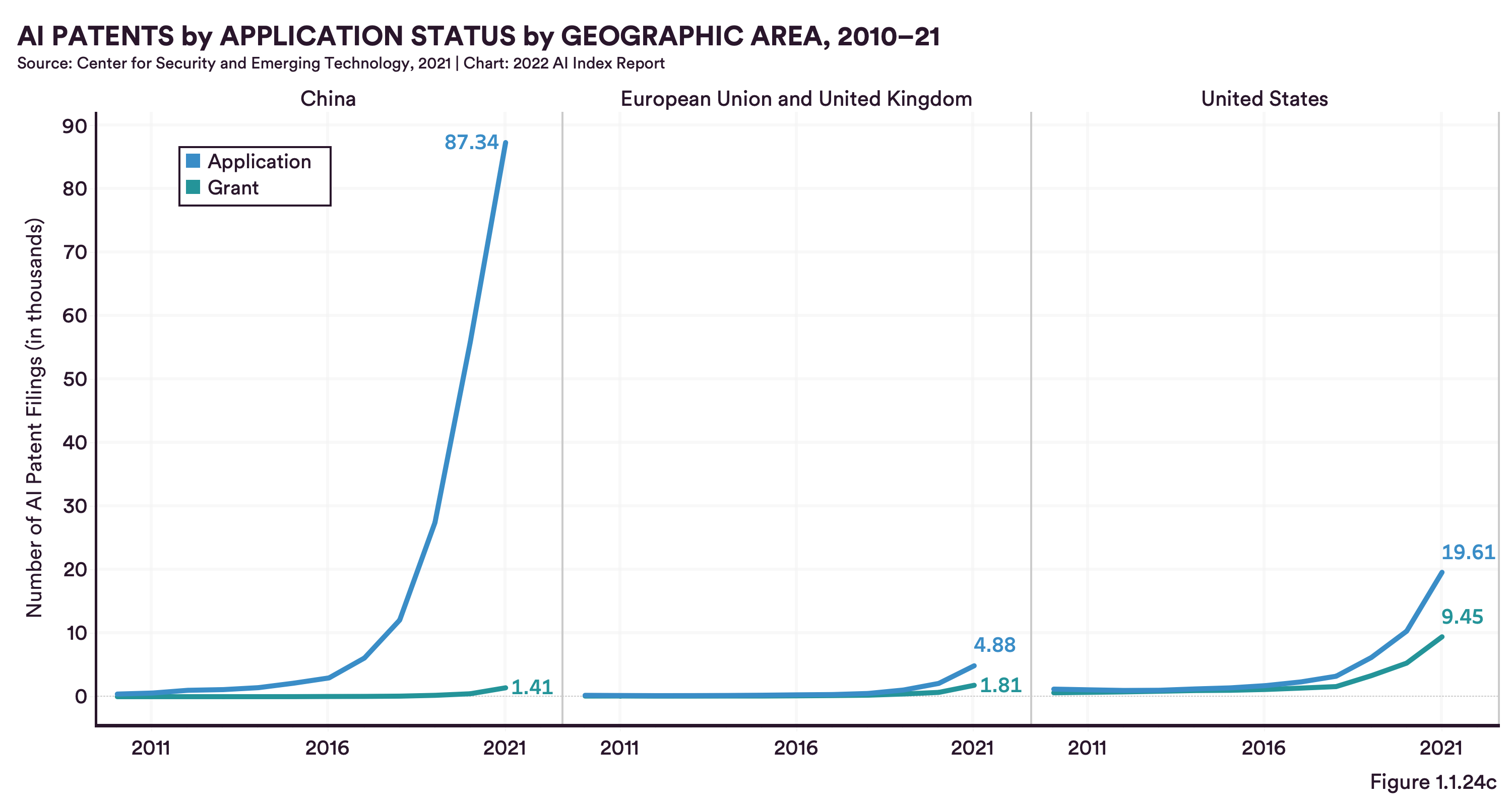 AI patents by application status by geographic area, 2010-21.