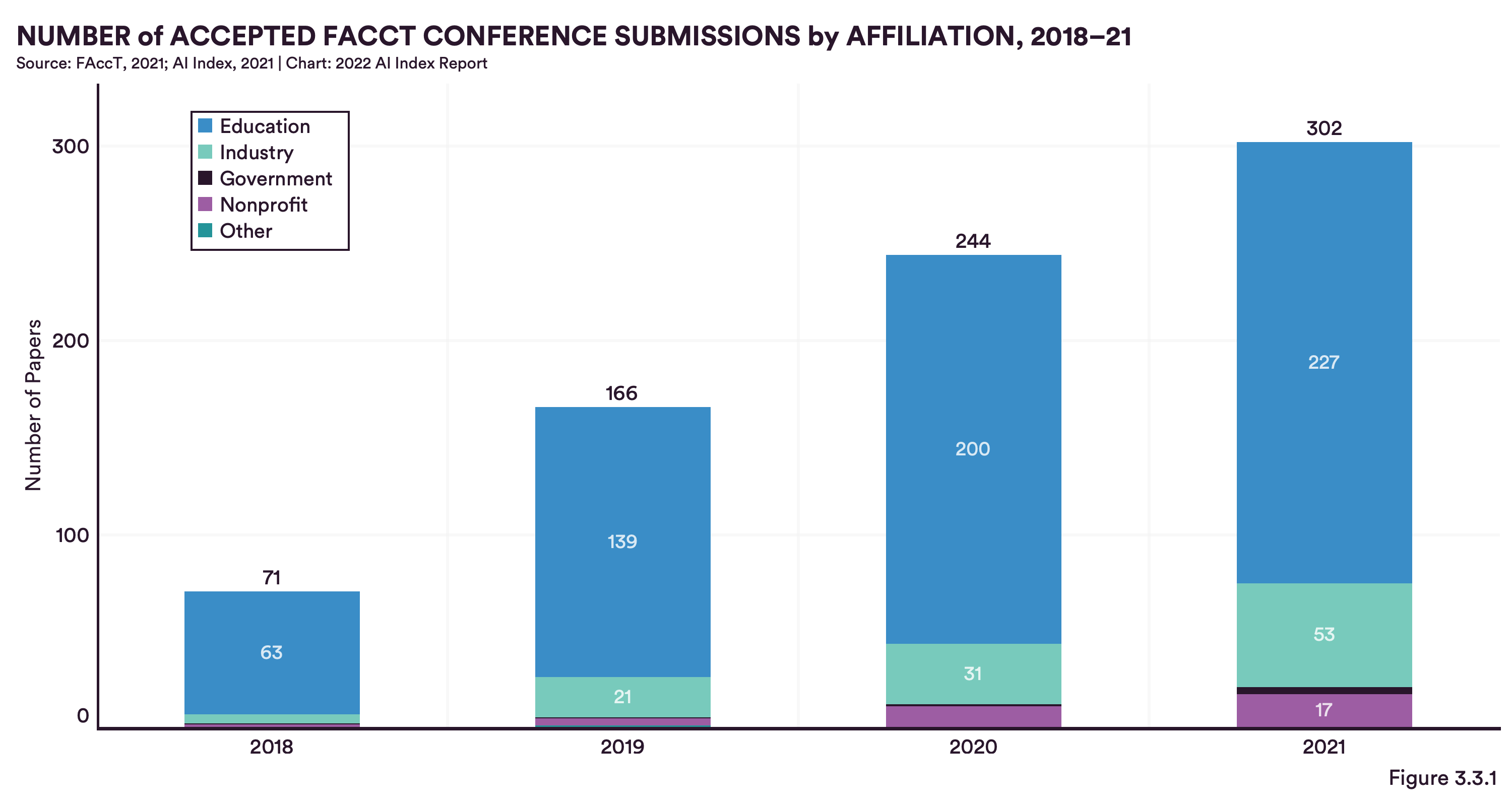 Number of accepted FACCT conference submissions by affiliation, 2018-21