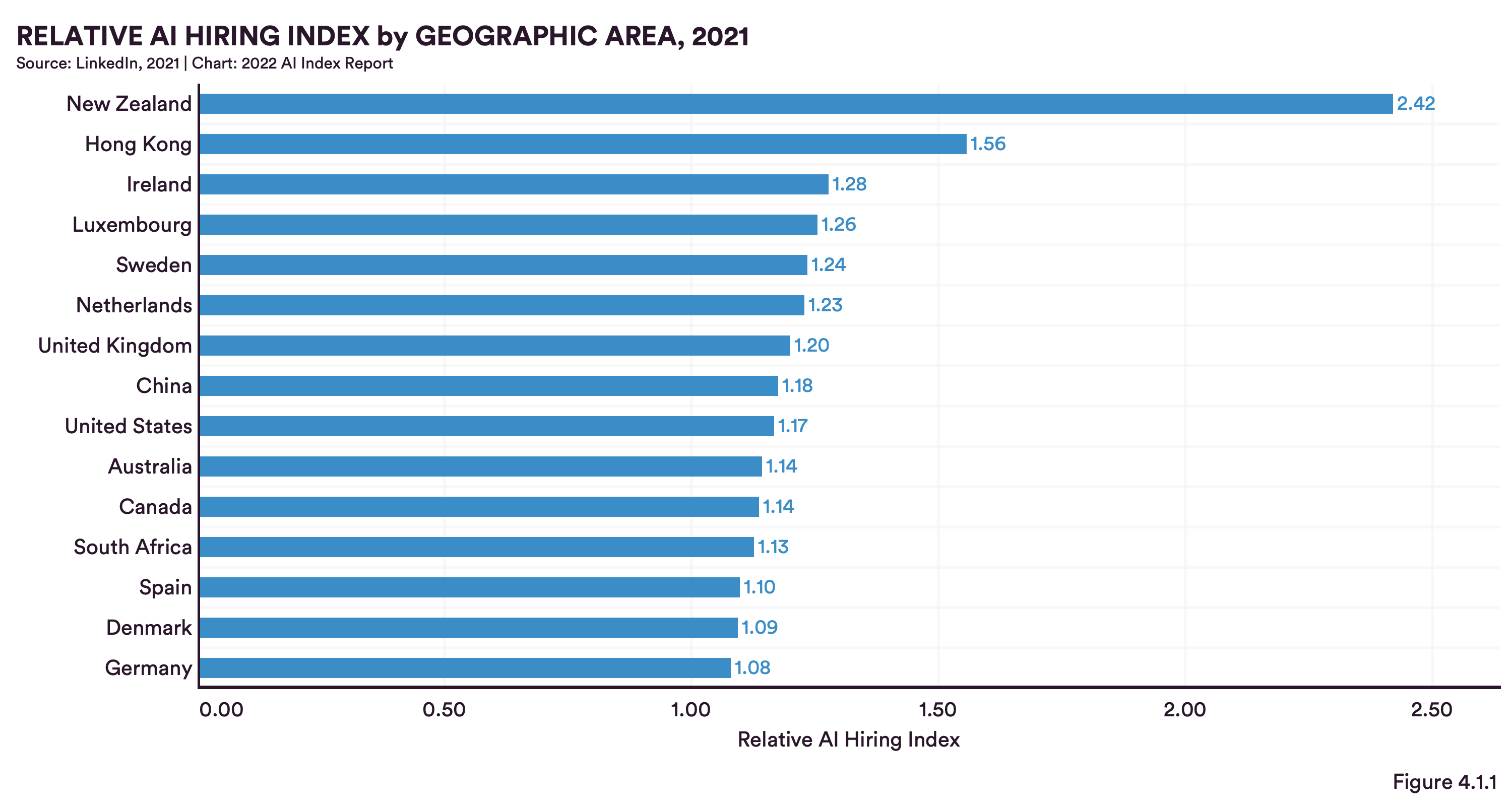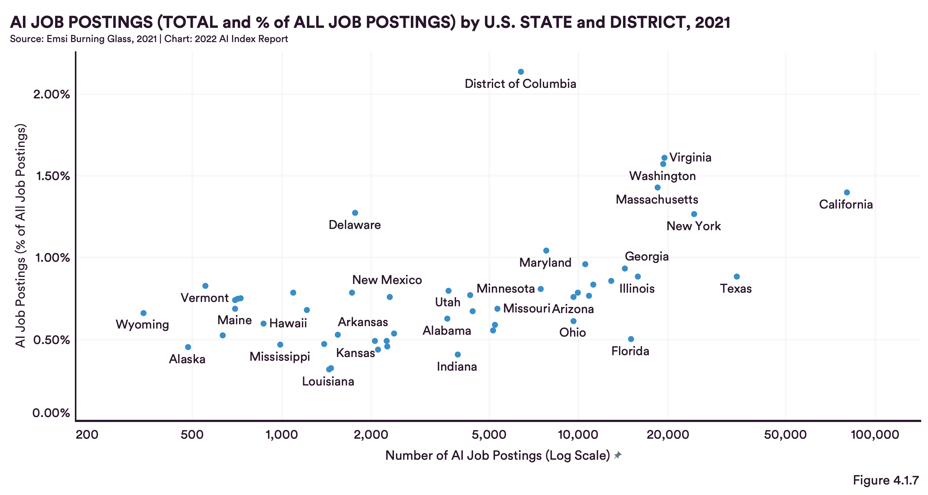 AI job postings (total and % of all job postings) by U.E. state and district, 2021.