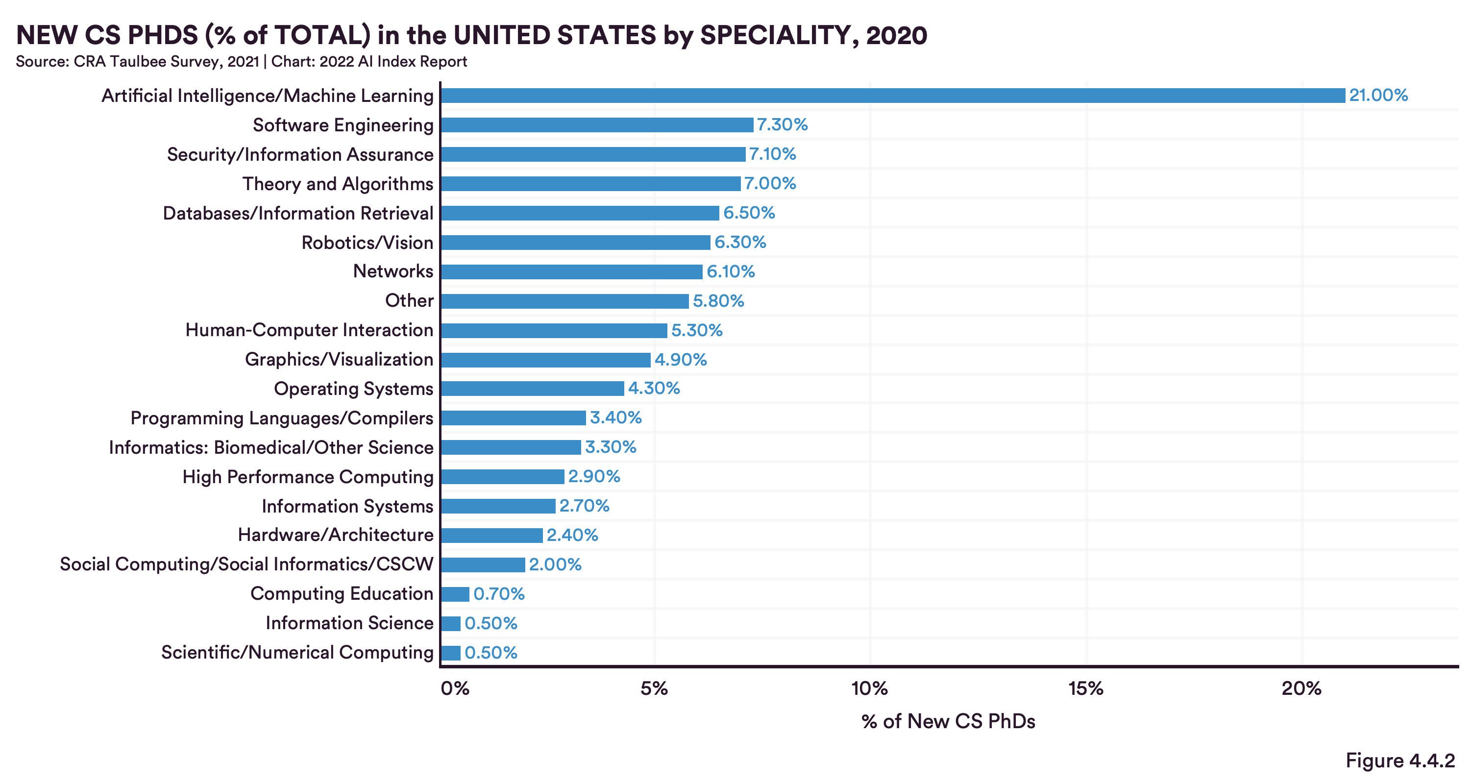 New CS PhDs (% of total) in the United States by specialty, 2020.