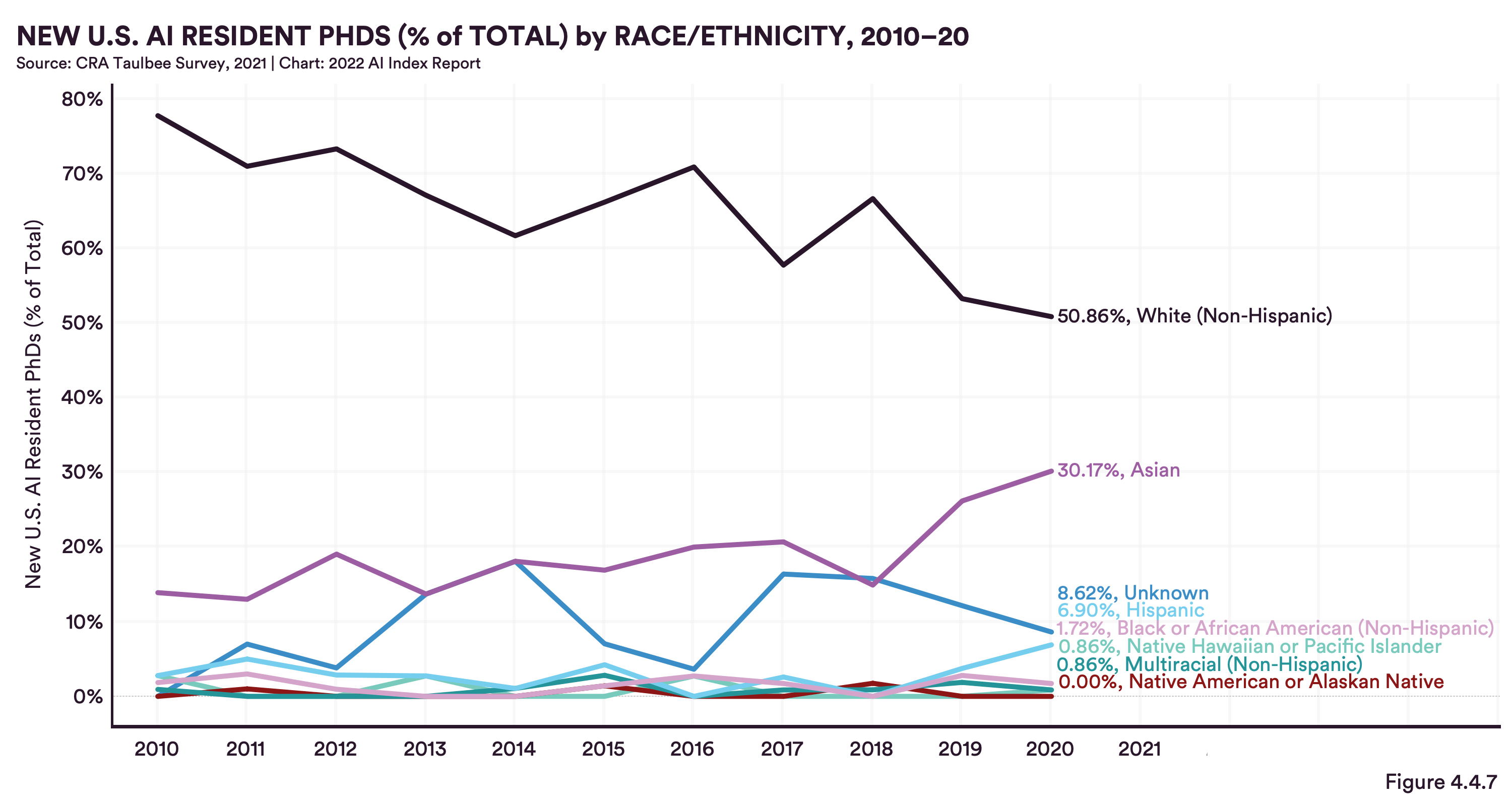 New U.S. AI resident PhDs (% of total) by race-ethnicity, 2010-20.