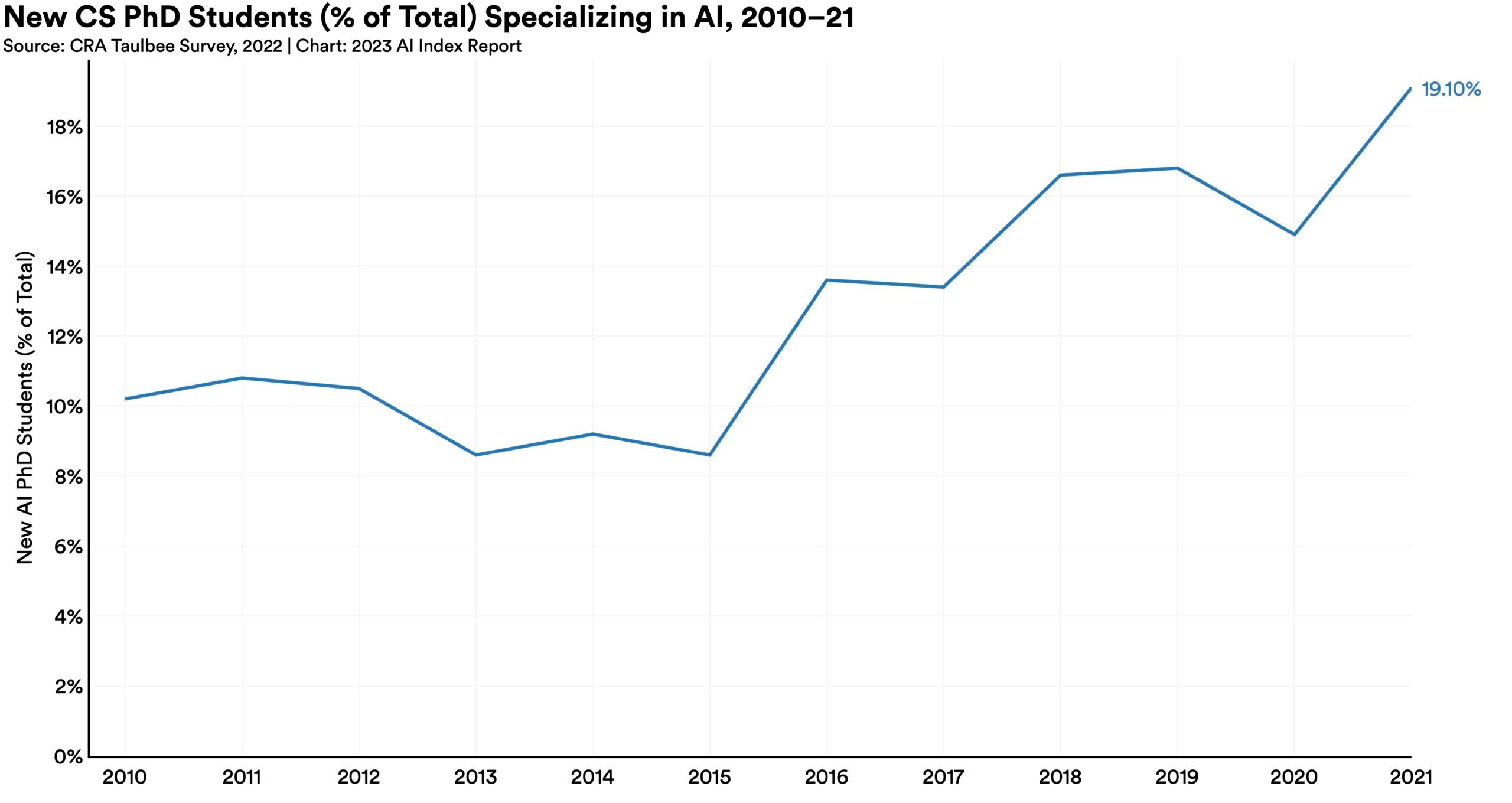 The proportion of new computer science PhD graduates from U.S. universities who specialized in AI jumped to 19.1% in 2021, from 14.9% in 2020 and 10.2% in 2010.