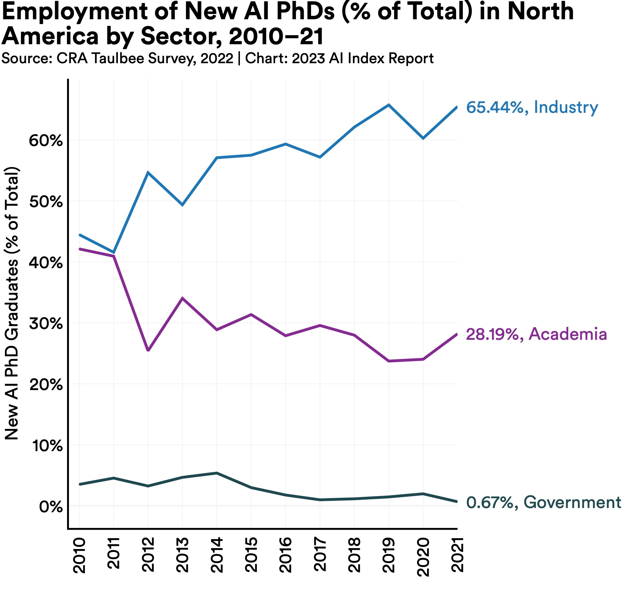In 2011, roughly the same proportion of new AI PhD graduates took jobs in industry (40.9%) as opposed to academia (41.6%). Since then, however, a majority of AI PhDs have headed to industry. In 2021, 65.4% of AI PhDs took jobs in industry, more than double the 28.2% who took jobs in academia.