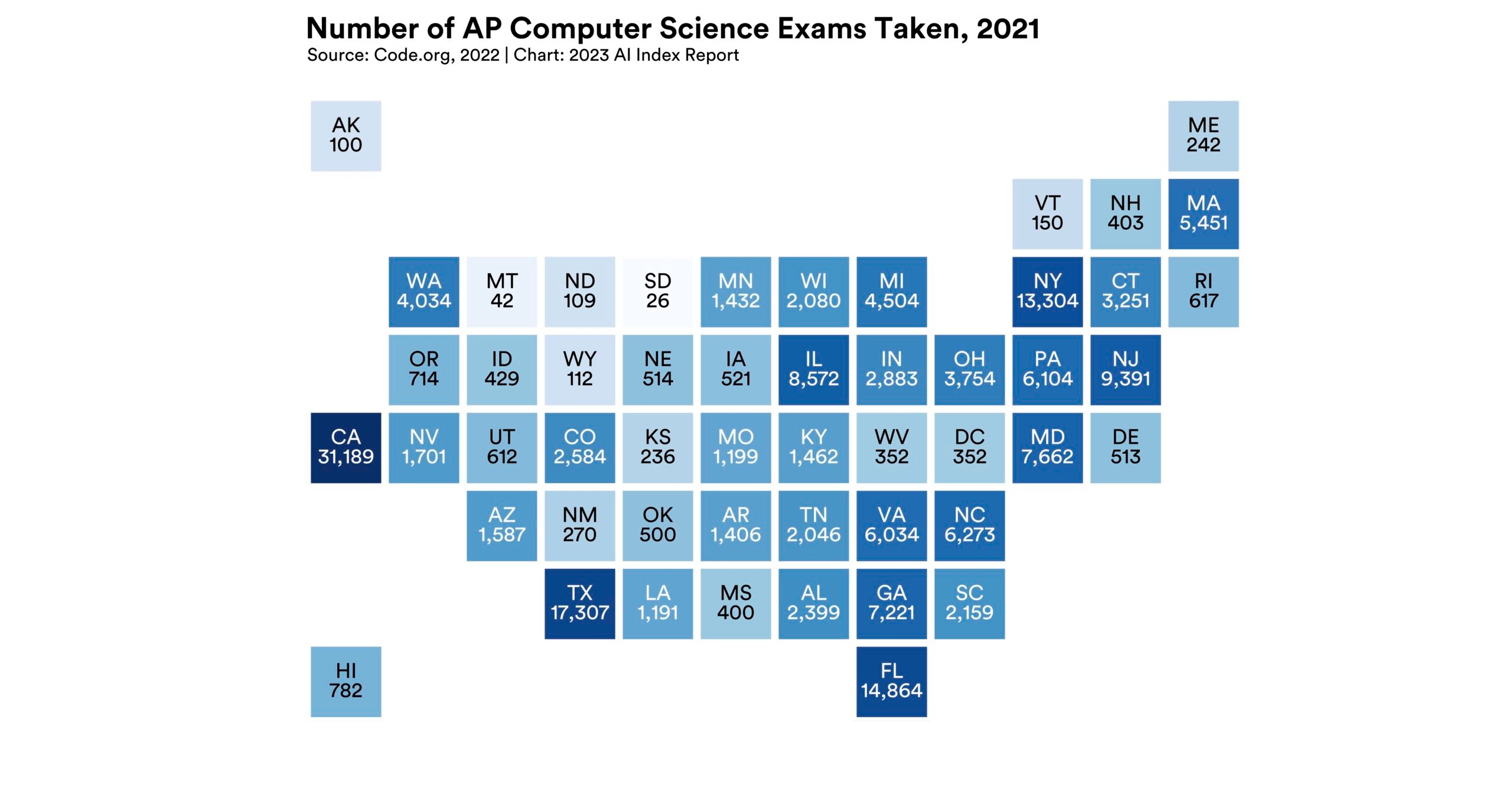 In 2021, a total of 181,040 AP computer science exams were taken by American students, a 1.0% increase from the previous year. Since 2007, the number of AP computer science exams has increased ninefold. As of 2021, 11 countries, including Belgium, China, and South Korea, have officially endorsed and implemented a K–12 AI curriculum.