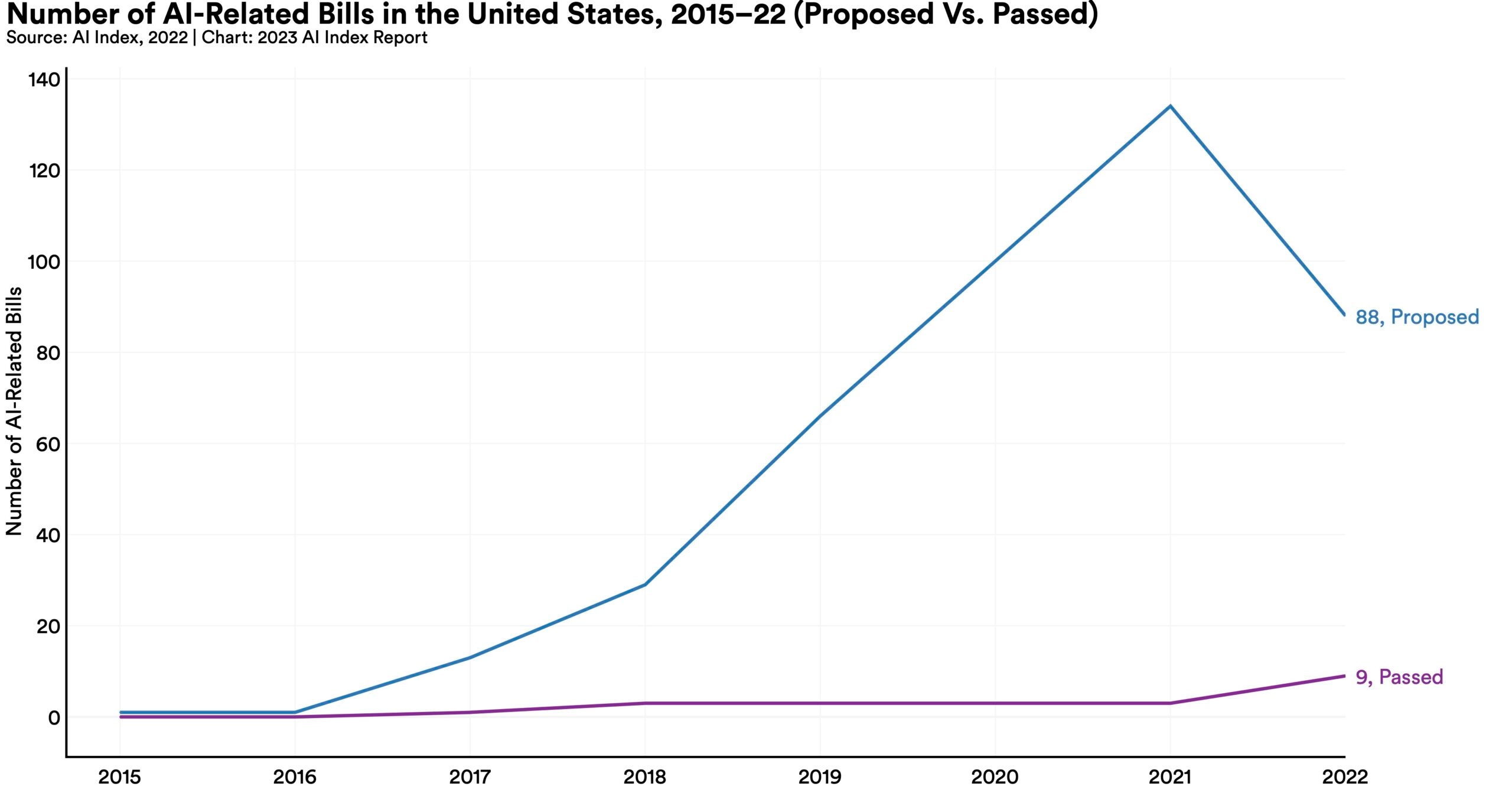 In 2021, only 2% of all federal AI bills in the United States were passed into law. This number jumped to 10% in 2022. Similarly, last year 35% of all state-level AI bills were passed into law.