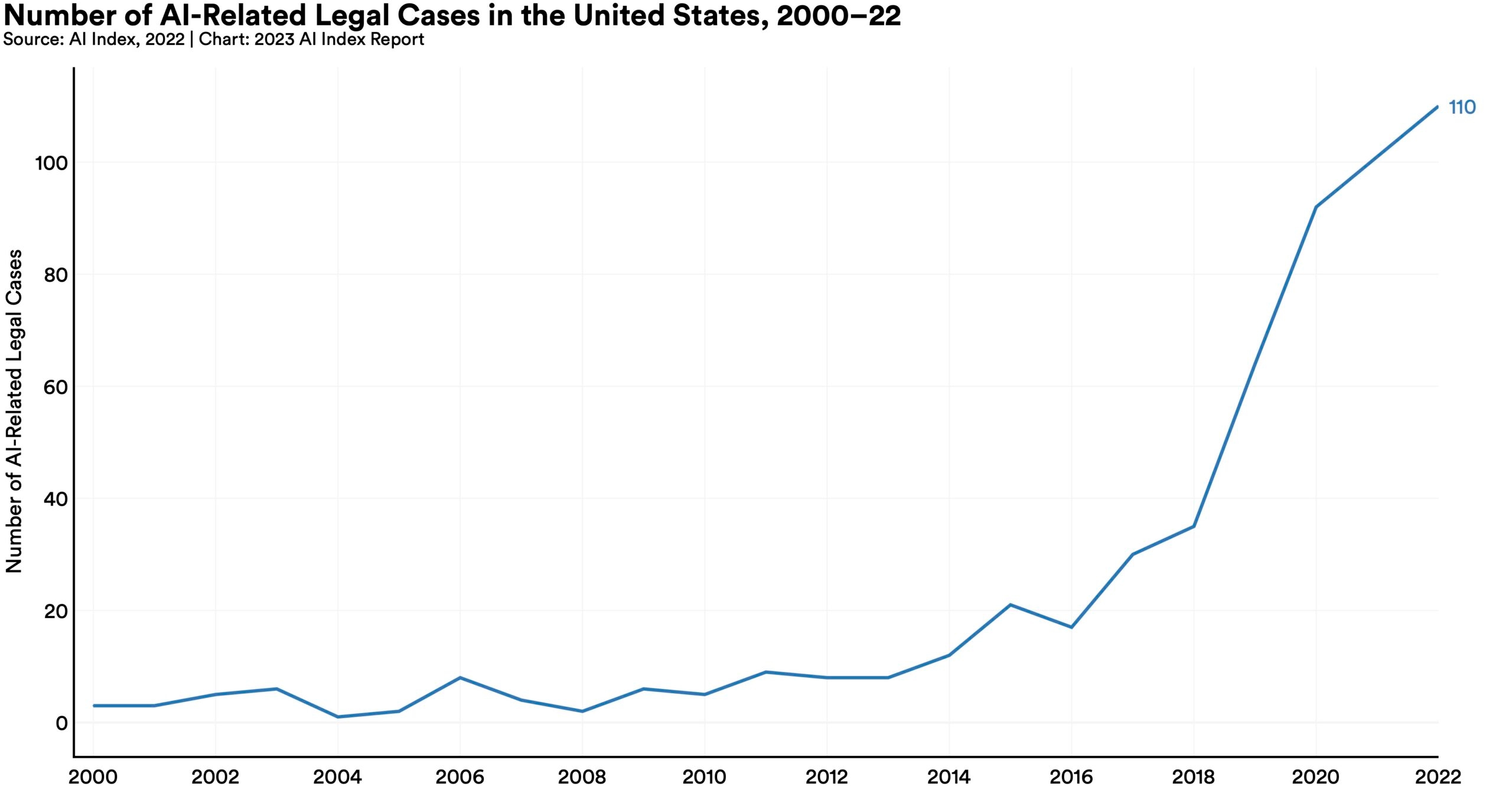 In 2022, there were 110 AI-related legal cases in United States state and federal courts, roughly seven times more than in 2016. The majority of these cases originated in California, New York, and Illinois, and concerned issues relating to civil, intellectual property, and contract law.