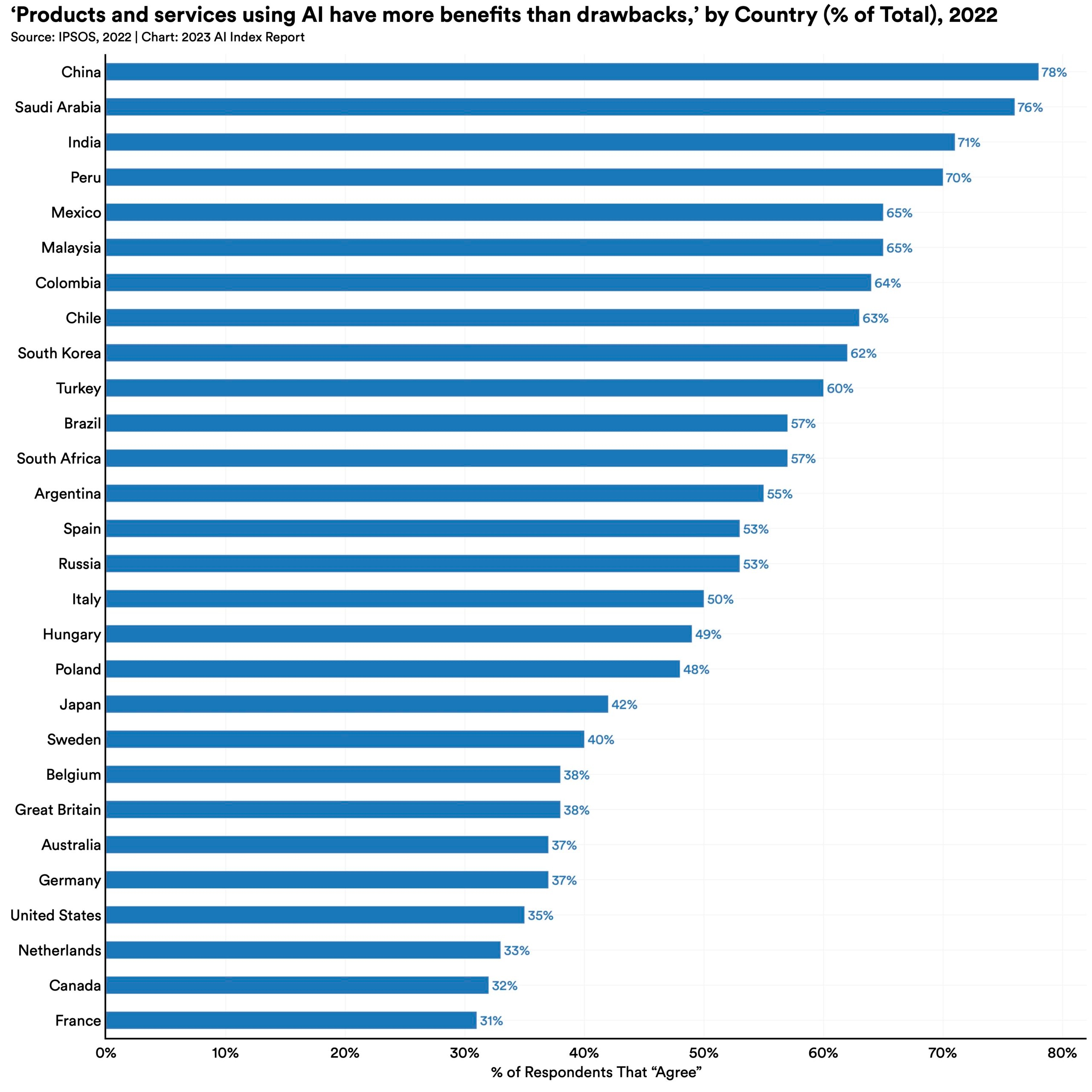 In a 2022 IPSOS survey, 78% of Chinese respondents (the highest proportion of surveyed countries) agreed with the statement that products and services using AI have more benefits than drawbacks. After Chinese respondents, those from Saudi Arabia (76%) and India (71%) felt the most positive about AI products. Only 35% of sampled Americans (among the lowest of surveyed countries) agreed that products and services using AI had more benefits than drawbacks.