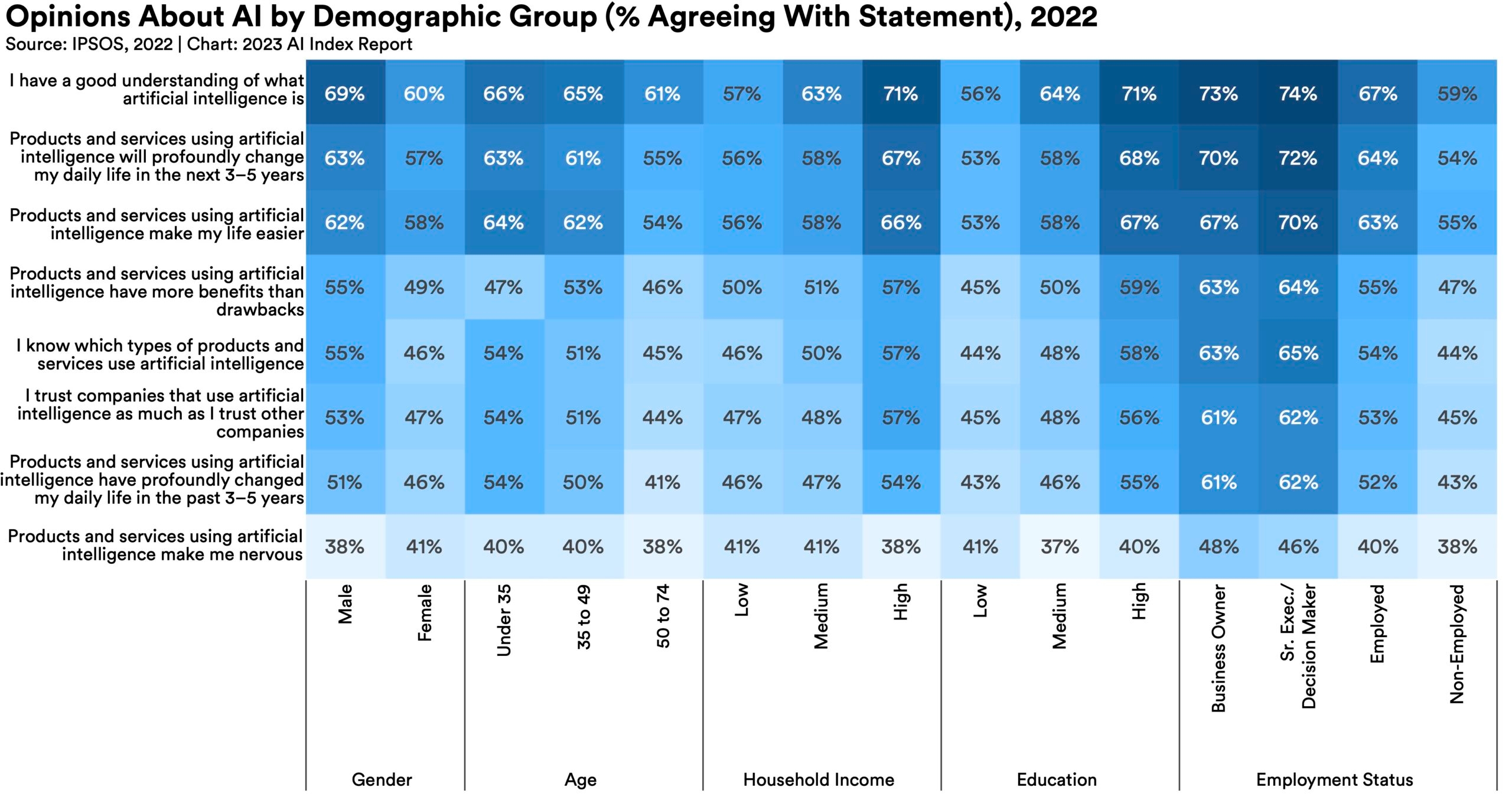 According to the 2022 IPSOS survey, men are more likely than women to report that AI products and services make their lives easier, trust companies that use AI, and feel that AI products and services have more benefits than drawbacks. A 2021 survey by Gallup and Lloyd’s Register Foundation likewise revealed that men are more likely than women to agree with the statement that AI will mostly help rather than harm their country in the next 20 years.