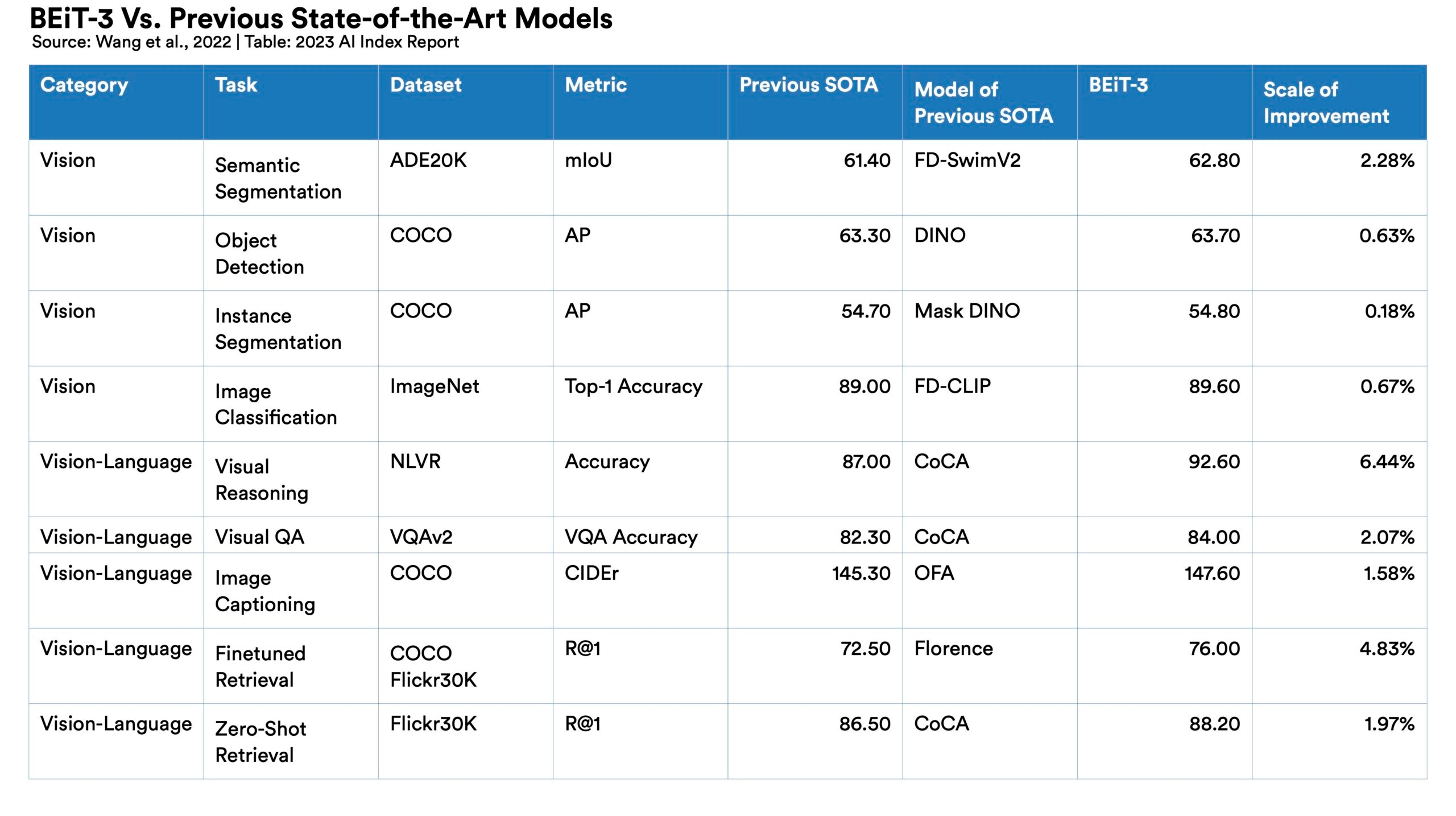 Traditionally AI systems have performed well on narrow tasks but have struggled across broader tasks. Recently released models challenge that trend; BEiT-3, PaLI, and Gato, among others, are single AI systems increasingly capable of navigating multiple tasks (for example, vision, language).