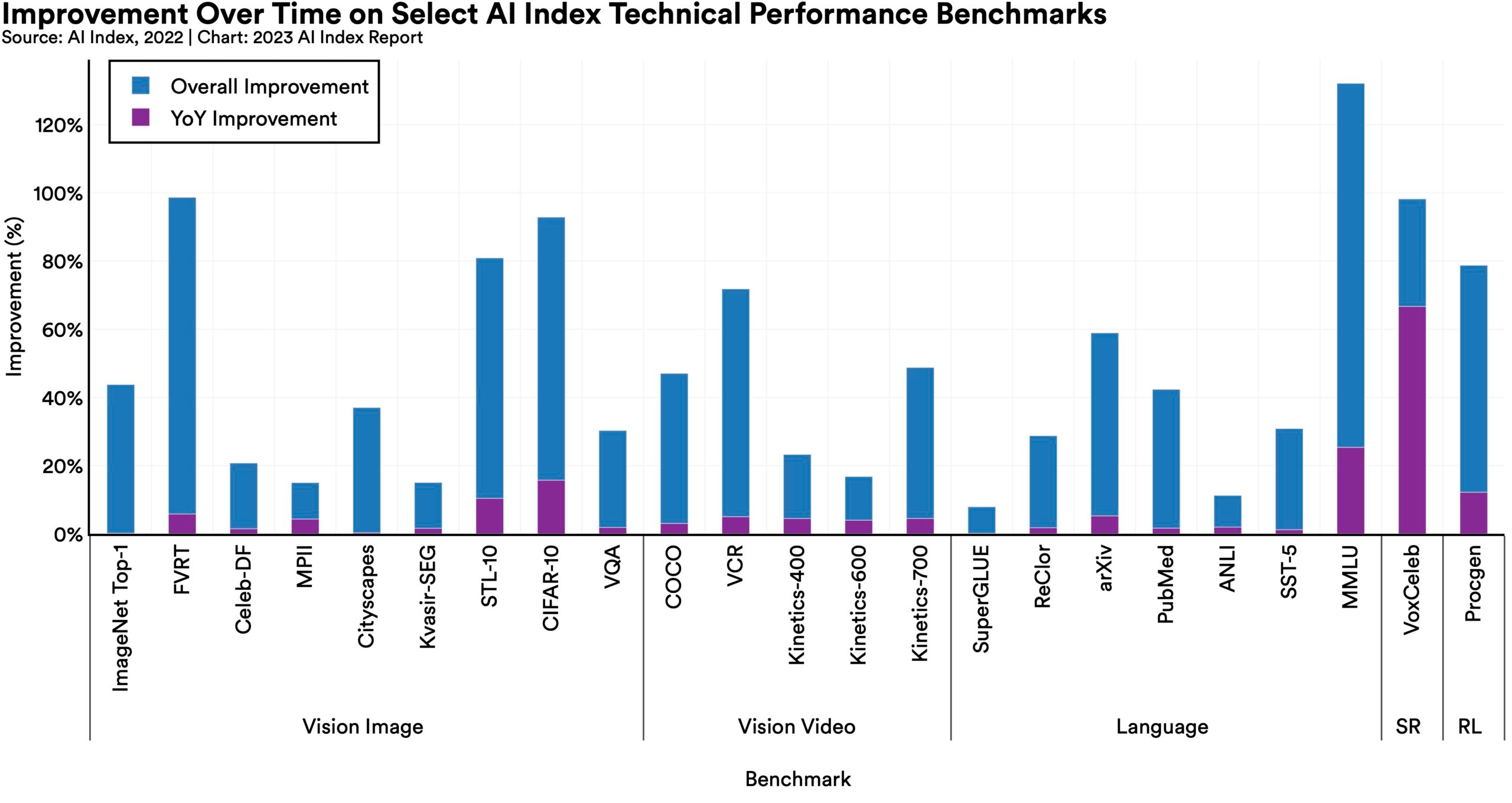 AI continued to post state-of-the-art results, but year-over-year improvement on many benchmarks continues to be marginal. Moreover, the speed at which benchmark saturation is being reached is increasing. However, new, more comprehensive benchmarking suites such as BIG-bench and HELM are being released.
