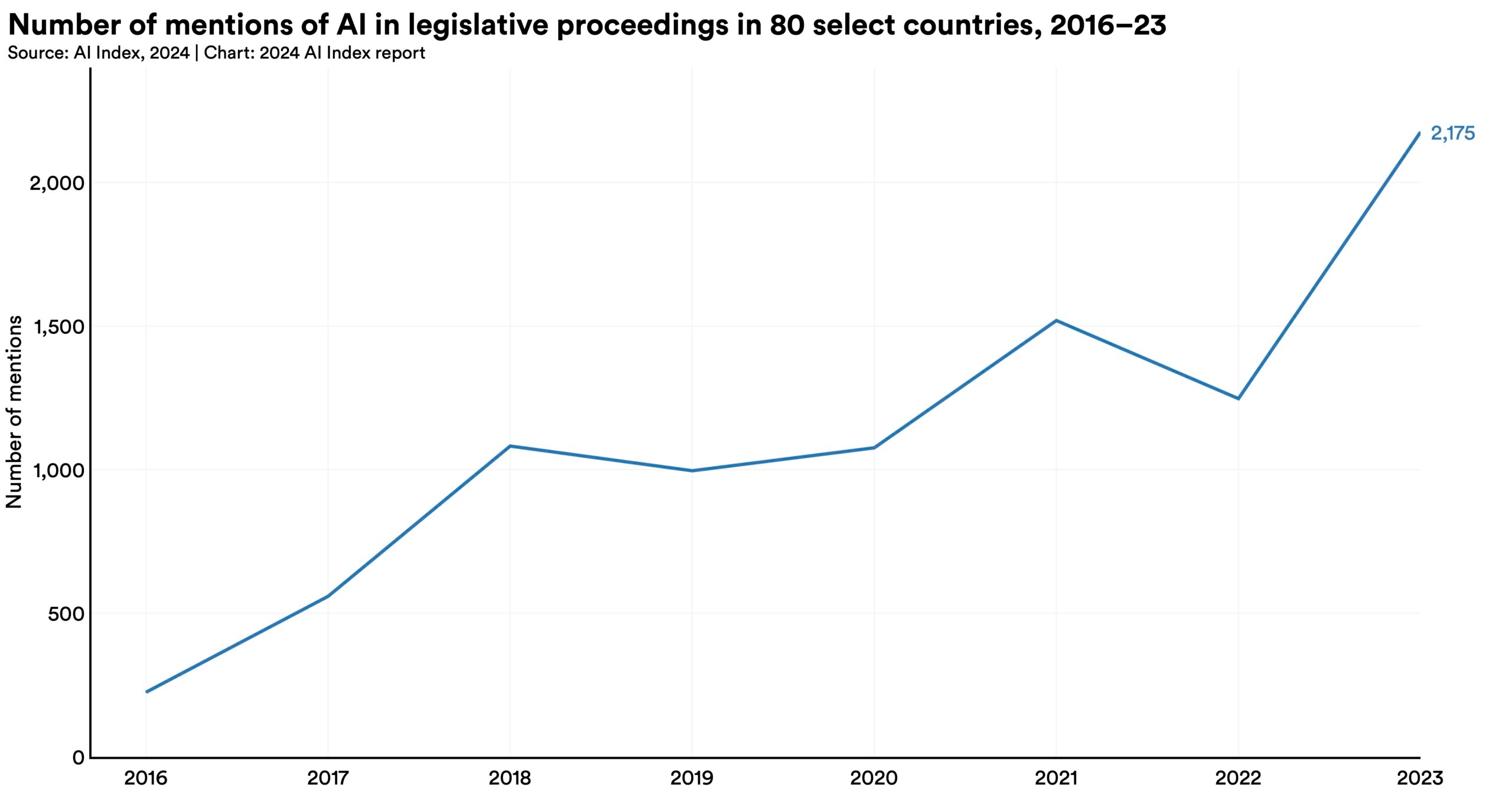 Mentions of AI in legislative proceedings across the globe have nearly doubled, rising from 1,247 in 2022 to 2,175 in 2023. AI was mentioned in the legislative proceedings of 49 countries in 2023. Moreover, at least one country from every continent discussed AI in 2023, underscoring the truly global reach of AI policy discourse.