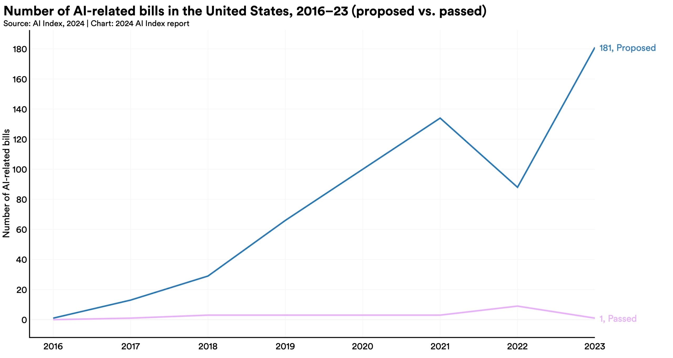 The year 2023 witnessed a remarkable increase in AI-related legislation at the federal level, with 181 bills proposed, more than double the 88 proposed in 2022.