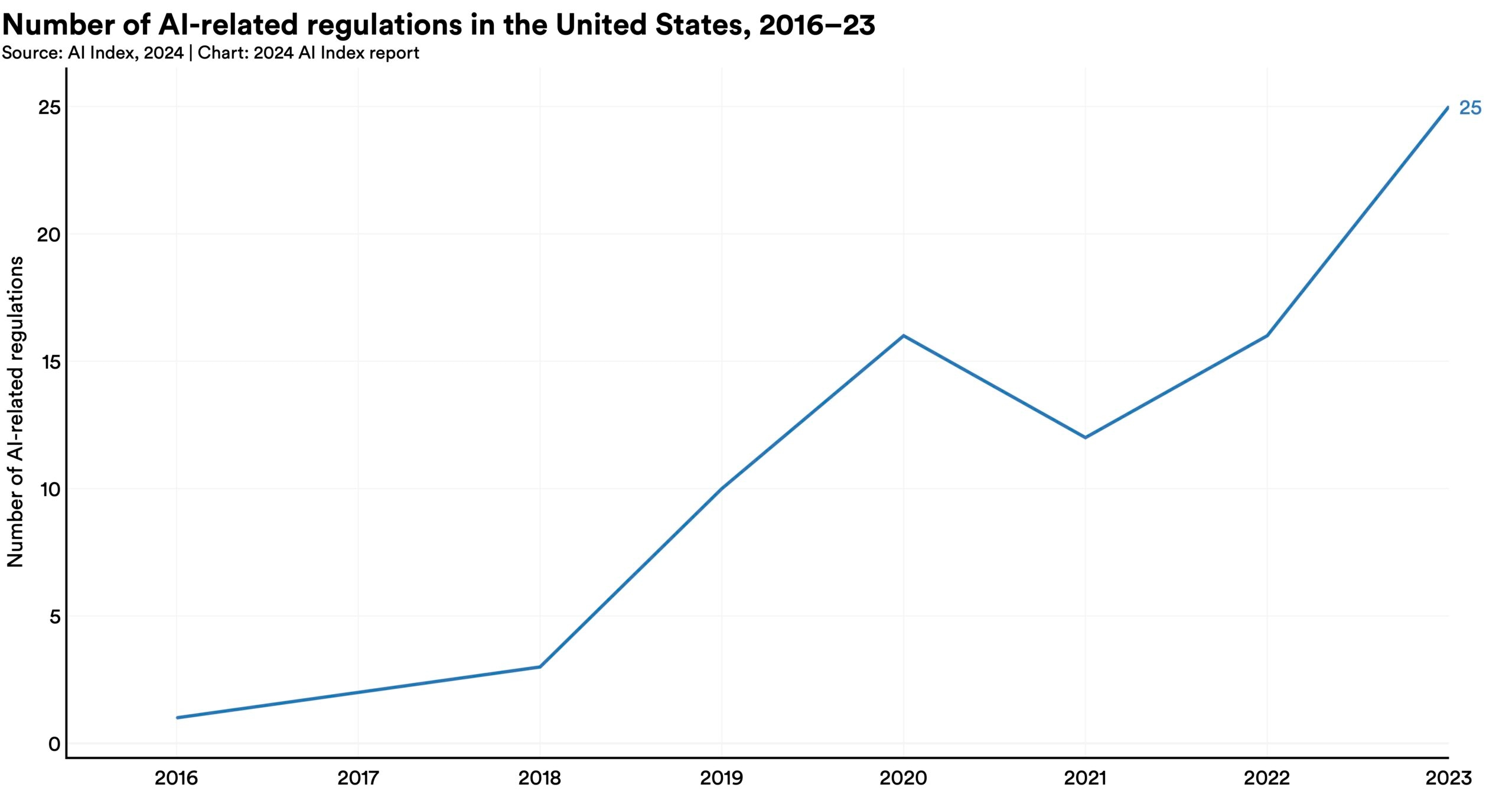 The number of AI-related regulations in the U.S. has risen significantly in the past year and over the last five years. In 2023, there were 25 AI-related regulations, up from just one in 2016. Last year alone, the total number of AI-related regulations grew by 56.3%.