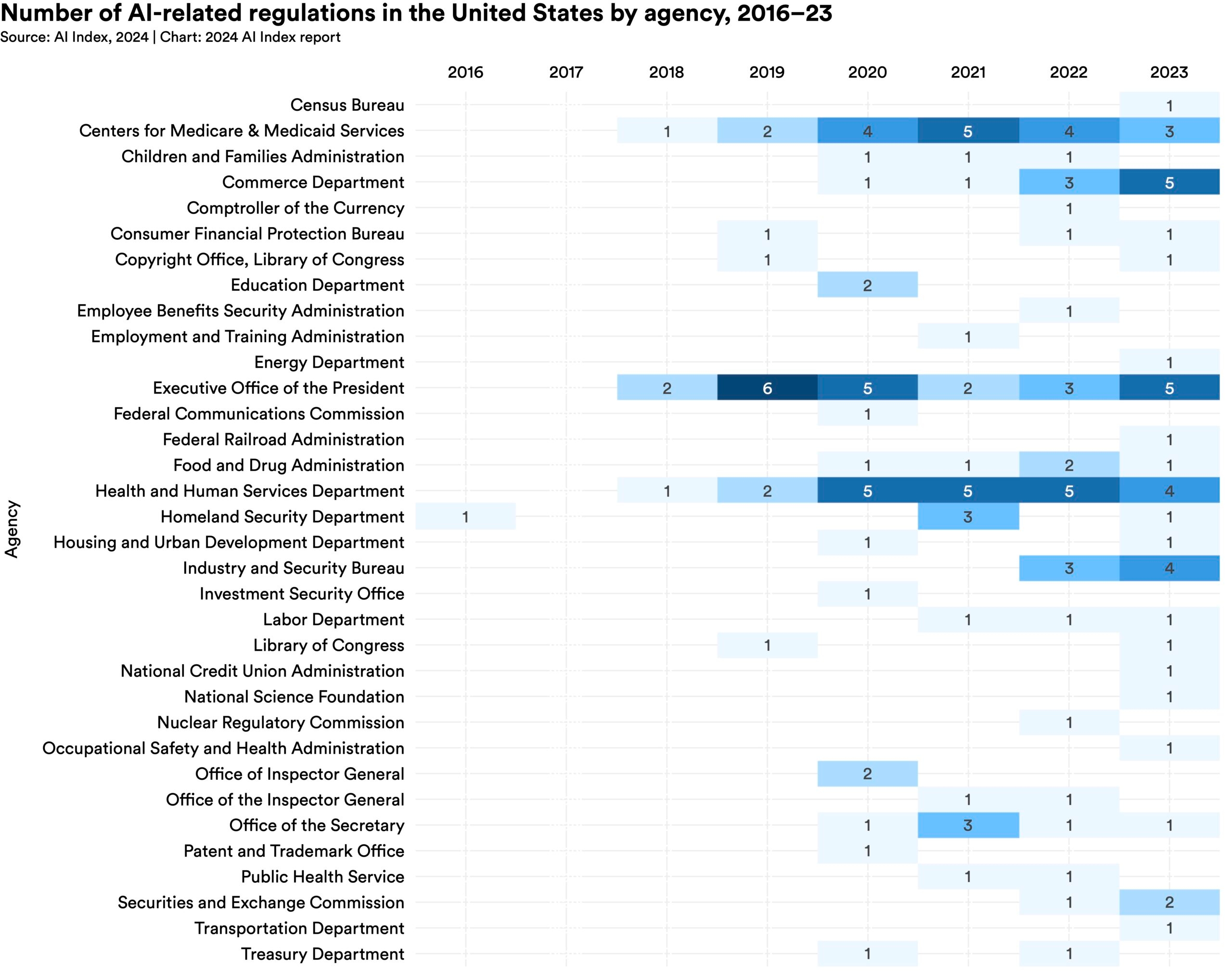 The number of U.S. regulatory agencies issuing AI regulations increased to 21 in 2023 from 17 in 2022, indicating a growing concern over AI regulation among a broader array of American regulatory bodies. Some of the new regulatory agencies that enacted AI-related regulations for the first time in 2023 include the Department of Transportation, the Department of Energy, and the Occupational Safety and Health Administration.