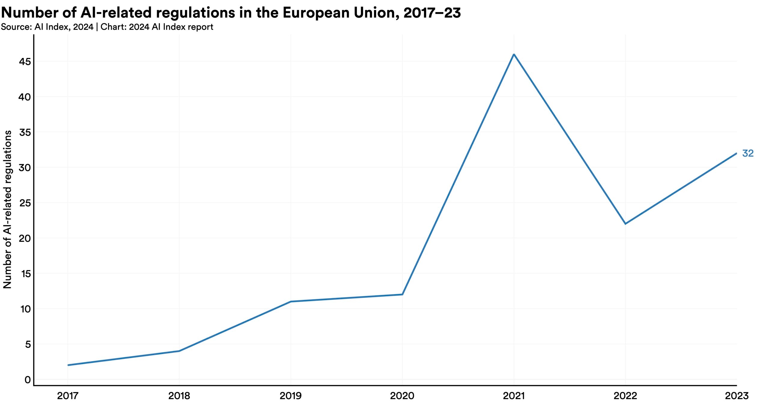 In 2023, policymakers on both sides of the Atlantic put forth substantial AI regulatory proposals. The European Union reached a deal on the terms of the AI Act, a landmark piece of legislation enacted in 2024. Meanwhile, President Biden signed an Executive Order on AI, the most notable AI policy initiative in the United States that year.