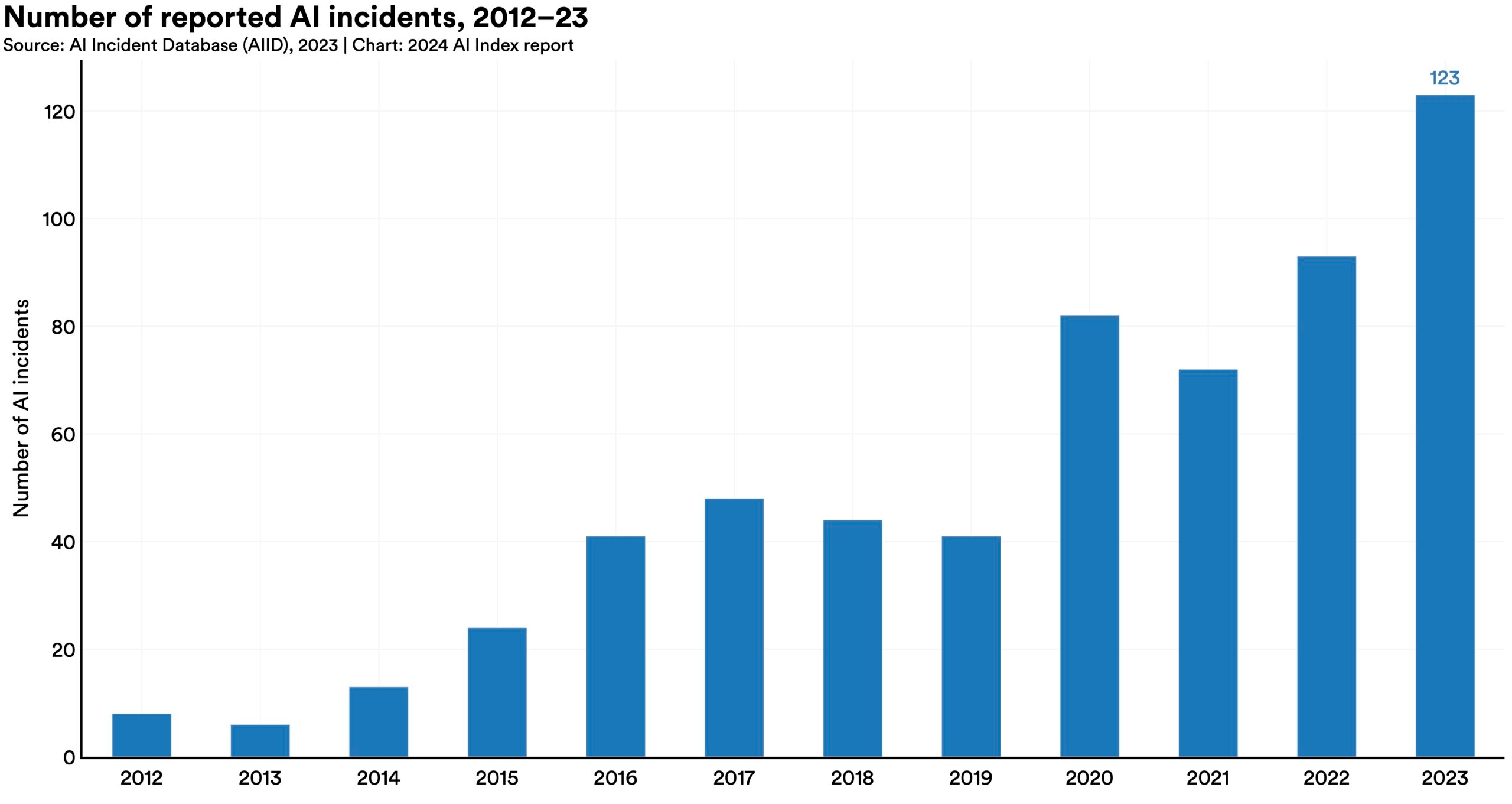 According to the AI Incident Database, which tracks incidents related to the misuse of AI, 123 incidents were reported in 2023, a 32.3% increase from 2022. Since 2013, AI incidents have grown by over twentyfold. A notable example includes AI-generated, sexually explicit deepfakes of Taylor Swift that were widely shared online.