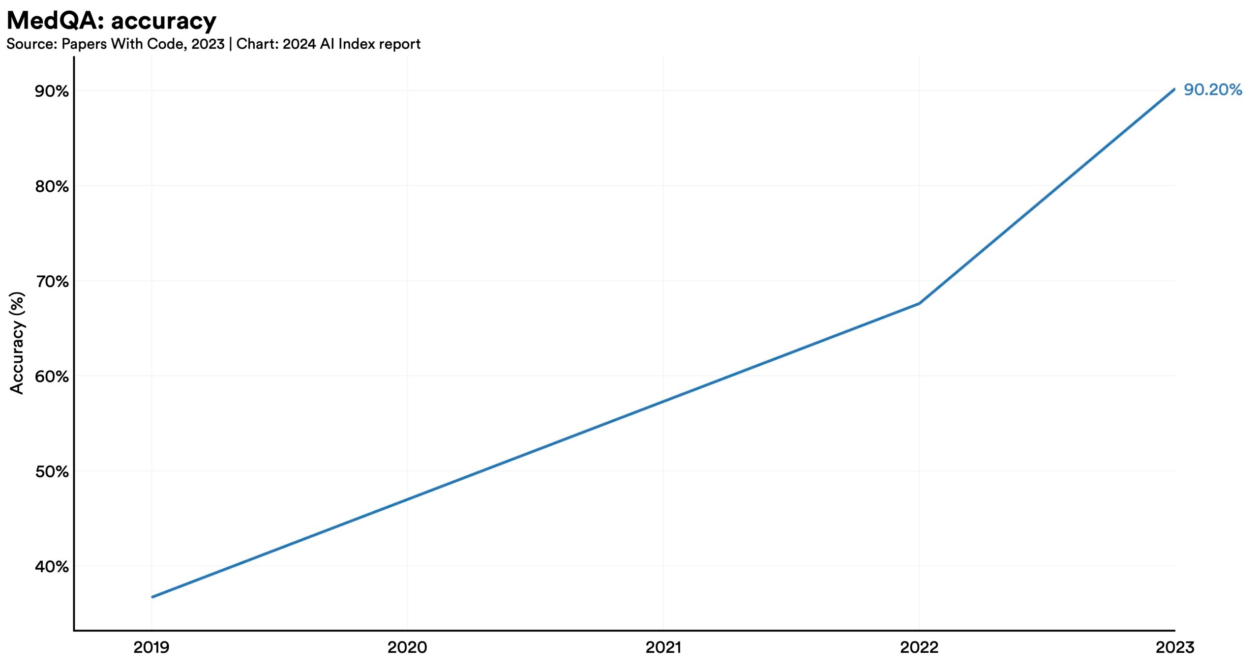 Over the past few years, AI systems have shown remarkable improvement on the MedQA benchmark, a key test for assessing AI’s clinical knowledge. The standout model of 2023, GPT-4 Medprompt, reached an accuracy rate of 90.2%, marking a 22.6 percentage point increase from the highest score in 2022. Since the benchmark’s introduction in 2019, AI performance on MedQA has nearly tripled.
