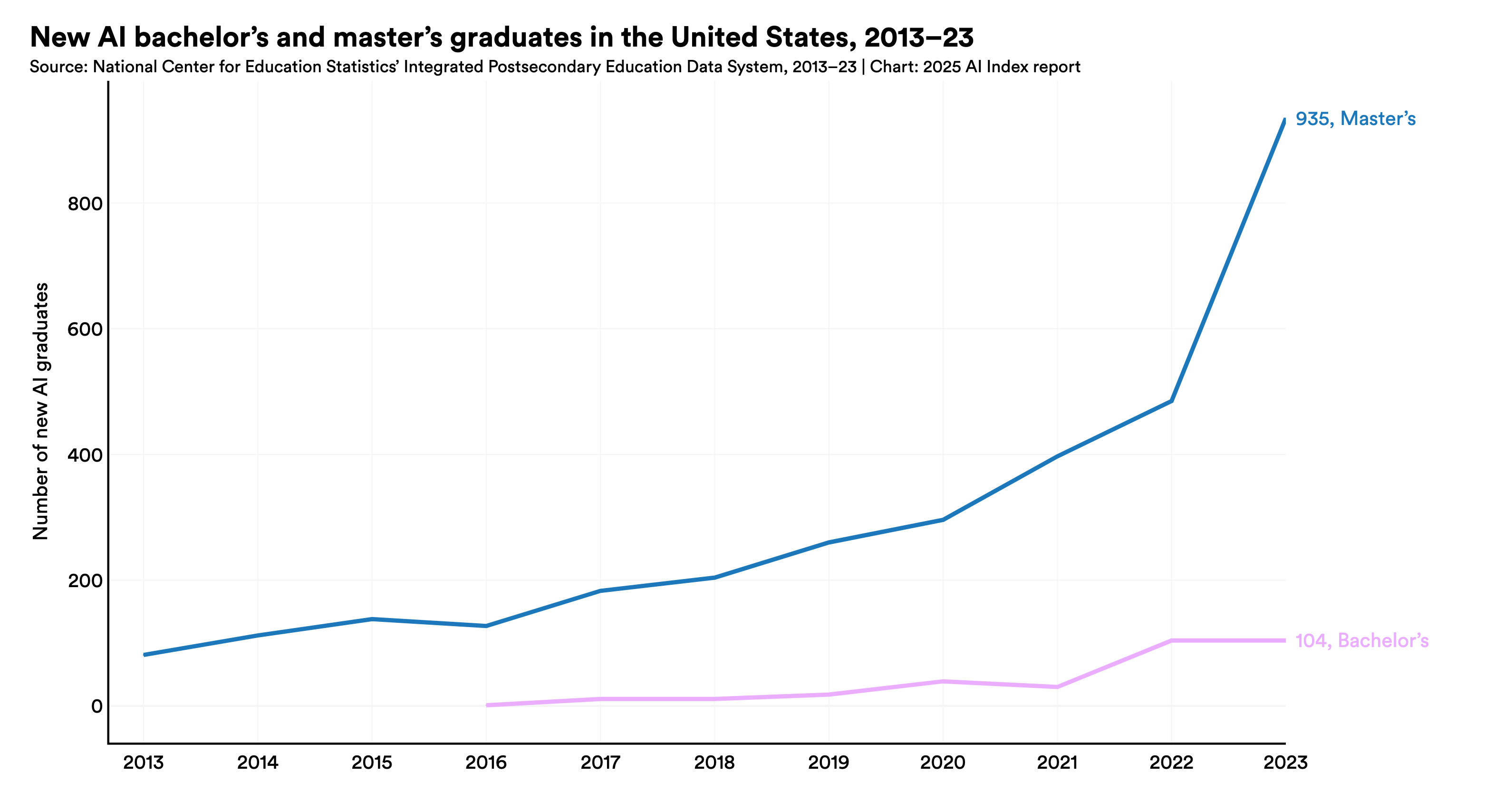 While increased attention on AI will be slower to emerge in the number of bachelor’s and PhD degrees, the surge in master’s degrees could indicate a future trend for all degree levels.
