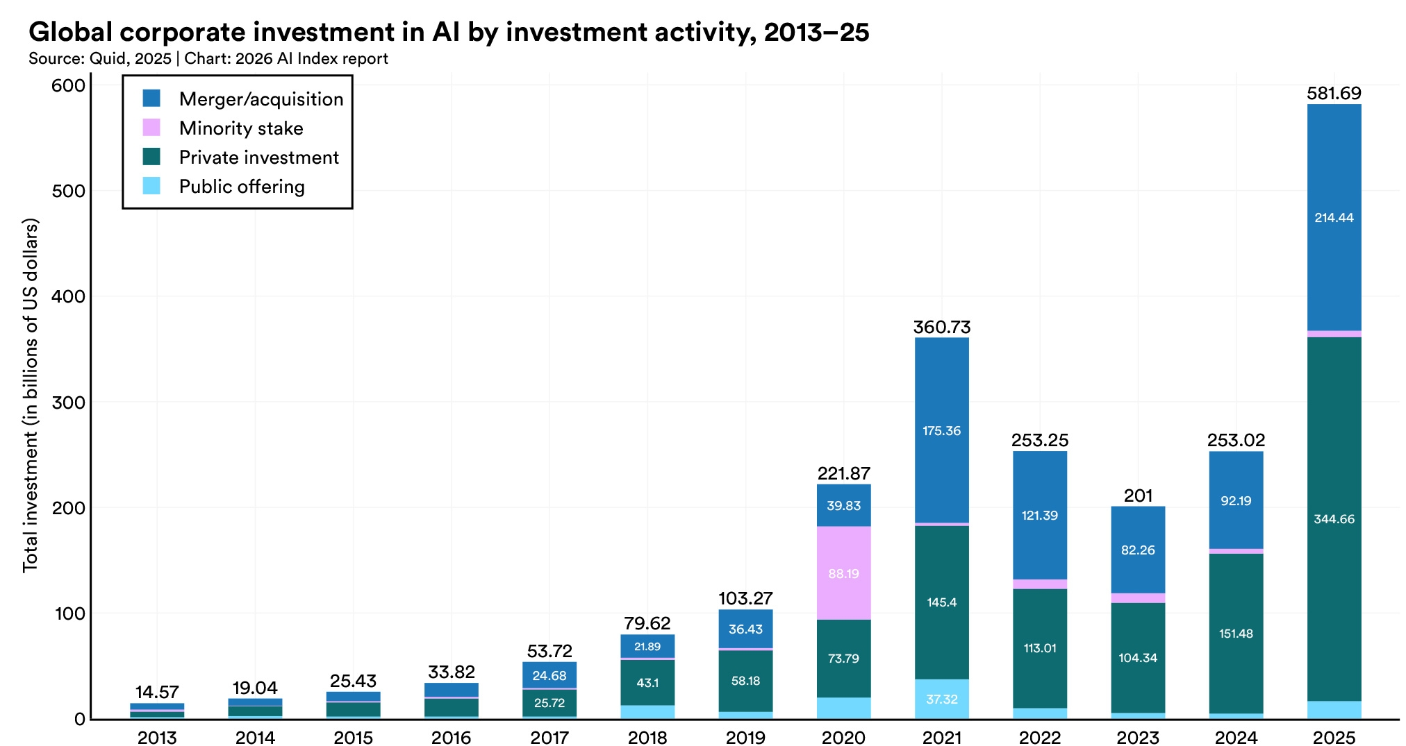 Private investment grew fastest at 127.5% and now accounts for 60% of the total. Generative AI led the surge, growing more than 200% and capturing nearly half of all private AI funding. Newly funded AI companies rose 71%, and billion-dollar funding events nearly doubled.