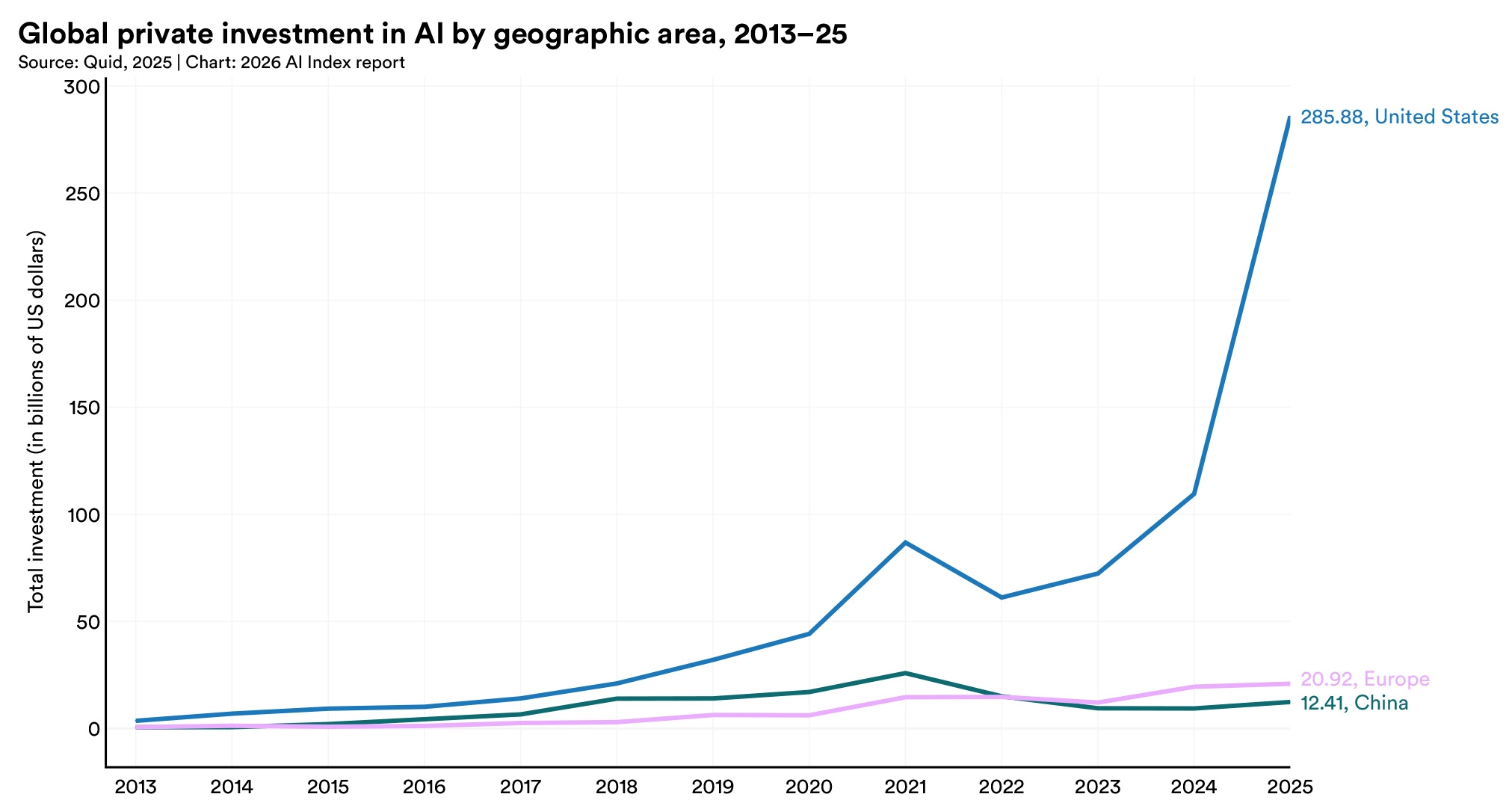In generative AI, U.S. investment exceeded the combined total of China and Europe by a wide margin. However, private investment figures likely understate China’s total AI spending, as government guidance funds have deployed an estimated $184 billion into AI firms between 2000 and 2023.