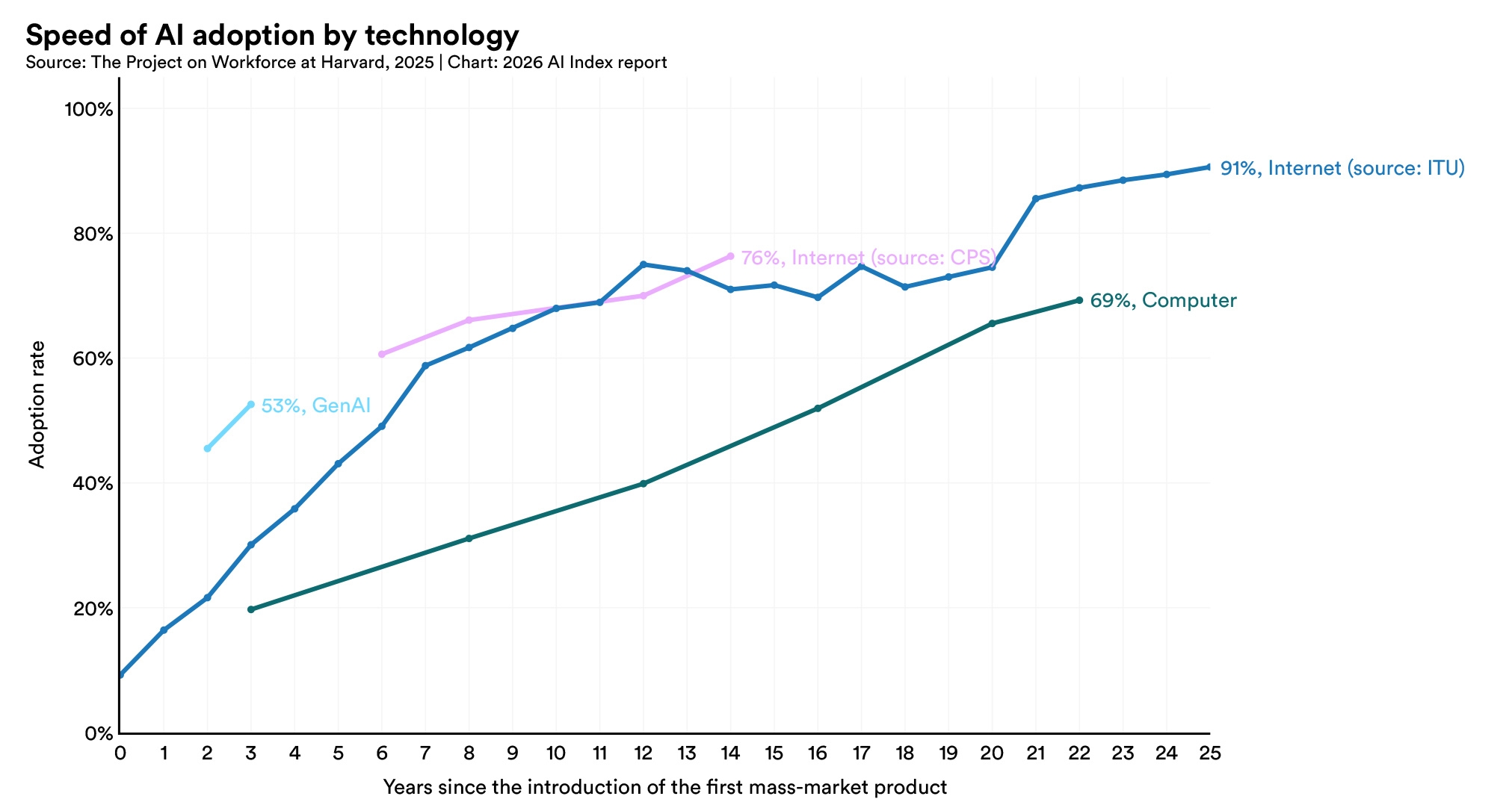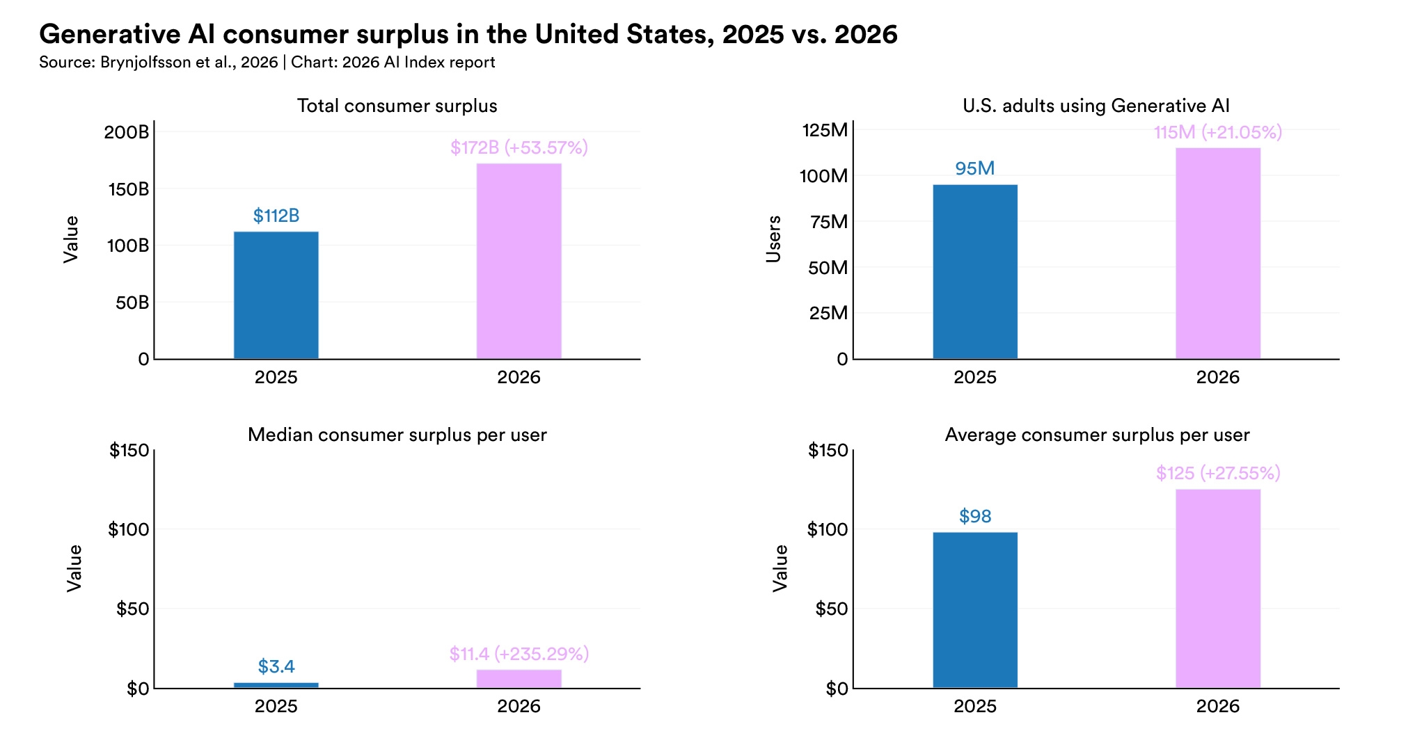 Estimated U.S. consumer surplus reached $172 billion annually by early 2026, up from $112 billion a year earlier, with the median value per user tripling over the same period. Most of these tools remain free or close to it.