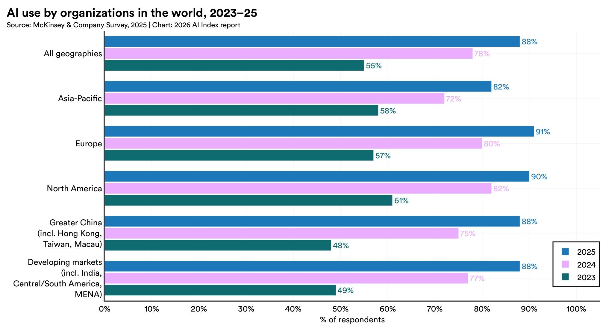 Generative AI is now used in at least one business function at 70% of organizations, and China and Europe posted the highest year-over-year increases. AI agent deployment was in the single digits across nearly all business functions.