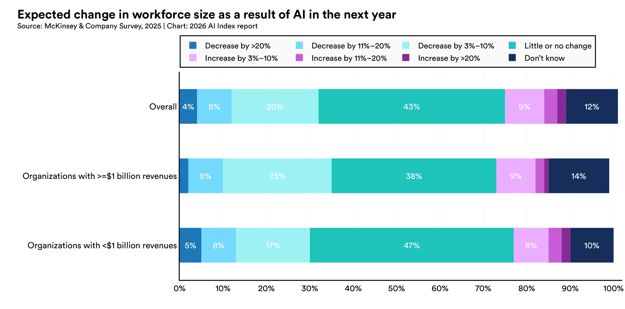 Almost half of organizations surveyed expected little to no change. Anticipated reductions are highest in service operations, supply chain, and software engineering. Across nearly all functions, anticipated decreases outpaces those already observed.