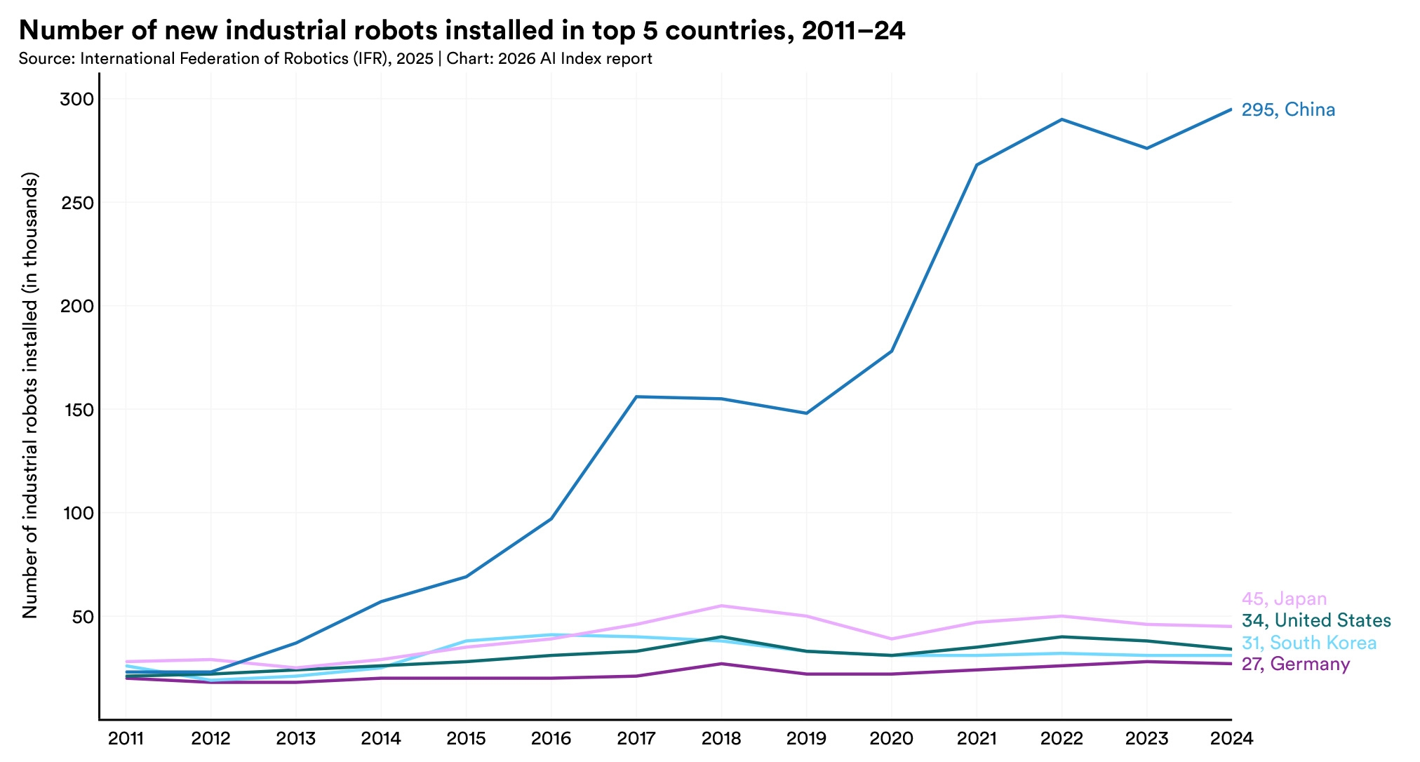 China accounted for 54% of industrial robots installed globally, up from 51.1% in 2023. Global year-over-year growth was flat, and several major markets, including the United States, Germany, and Italy saw declines. Taiwan was an exception, recording the highest year-over-year growth at 33%.