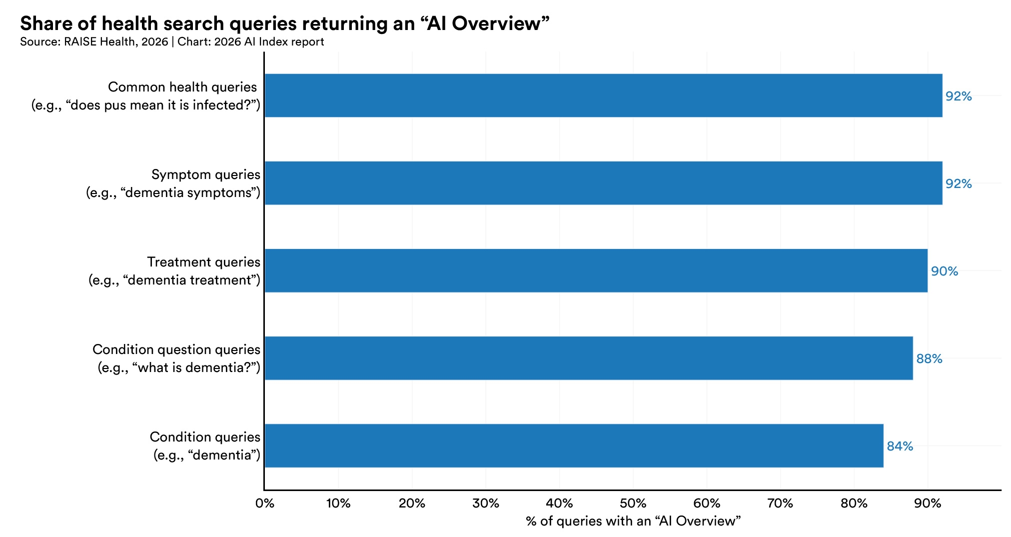 Symptom and common health questions trigger an AI Overview 92% of the time, followed by treatment and condition queries. These summaries are now a routine feature of health information searches, shaping the initial interpretation of users' questions.