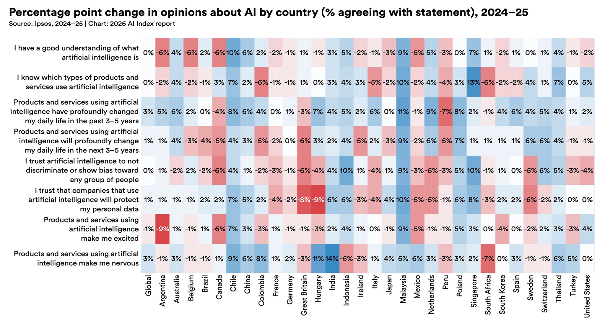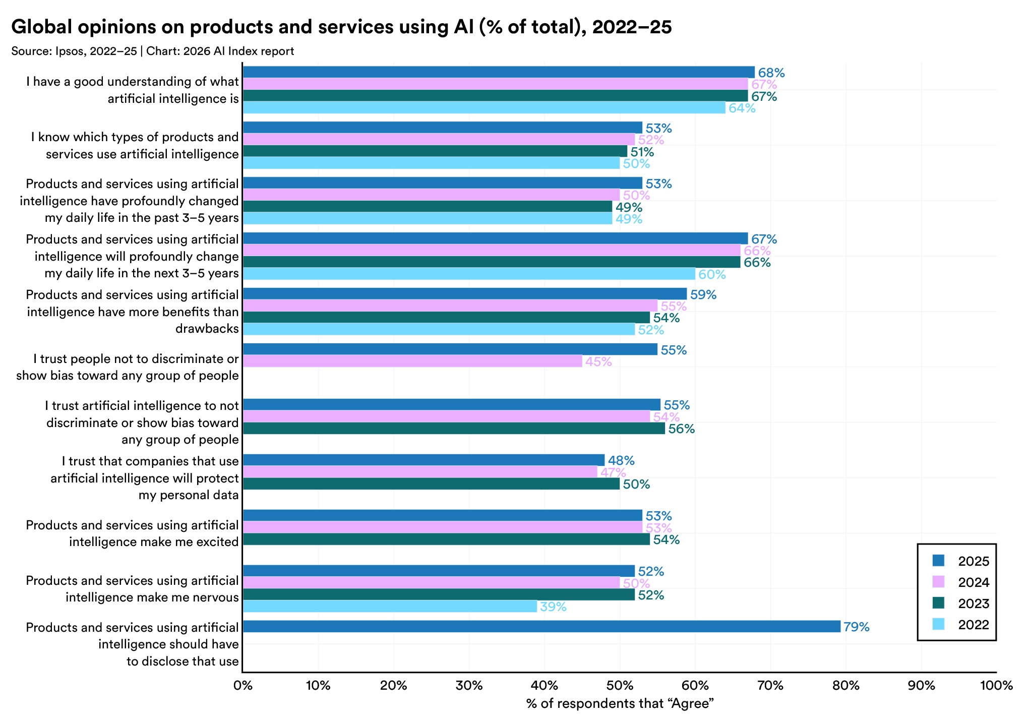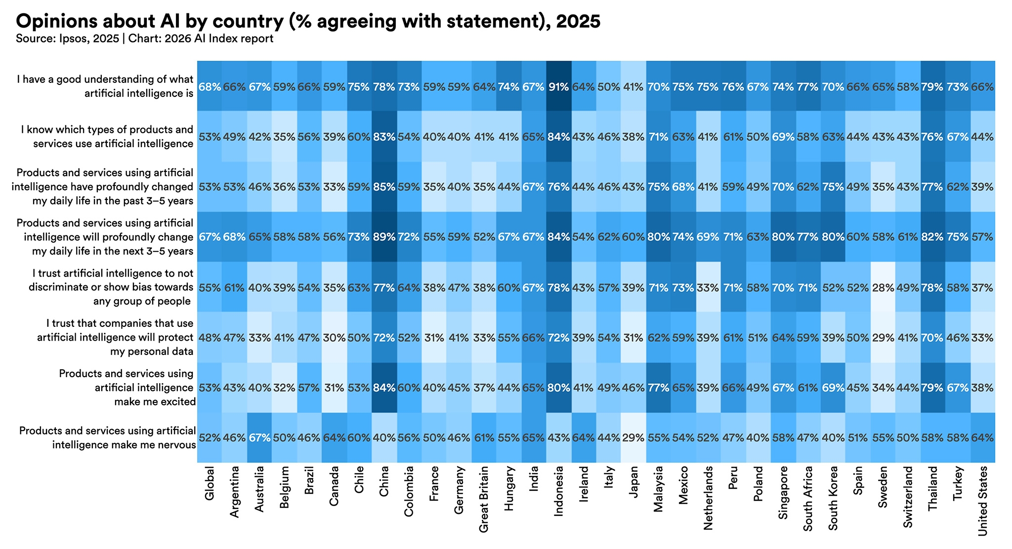 Globally, the share of respondents who say AI products and services offer more benefits than drawbacks rose from 55% in 2024 to 59% in 2025, even as the share saying these products make them nervous increased to 52%.