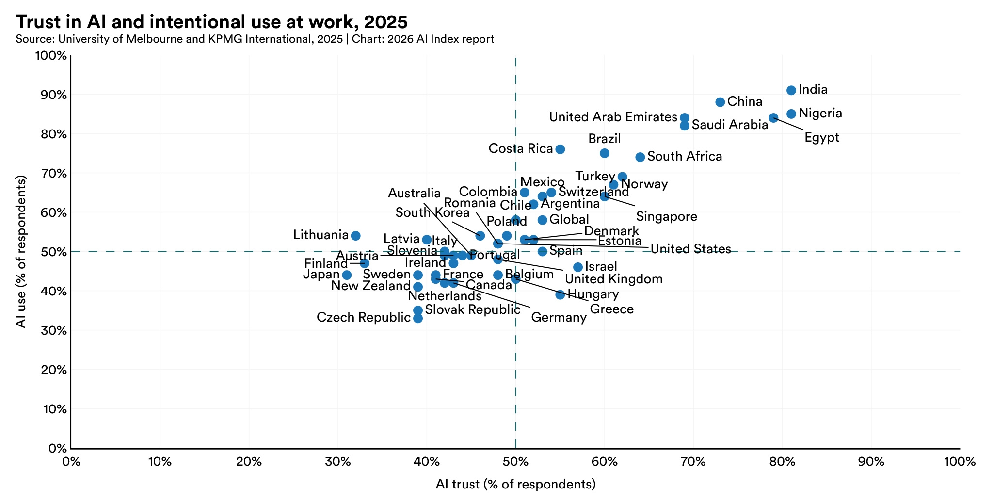 In 2025, 58% of employees globally reported using AI at work on a semiregular or regular basis, but in India, China, Nigeria, the United Arab Emirates, Egypt, and Saudi Arabia, the share exceeded 80%.