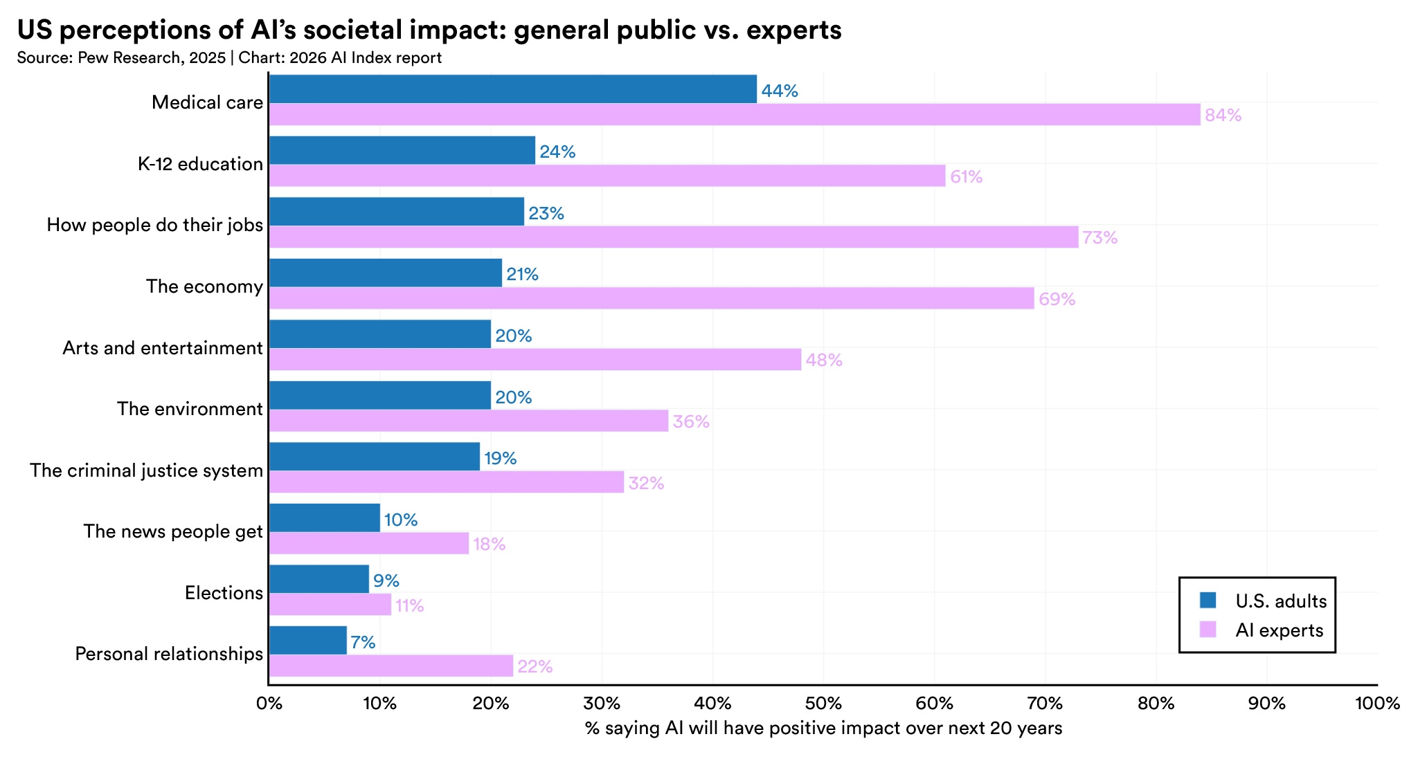 On how people do their jobs, 73% of experts expect a positive impact compared to just 23% of the public, a 50-point gap. Similar divides appear for the economy (69% vs. 21%) and medical care (84% vs. 44%).
