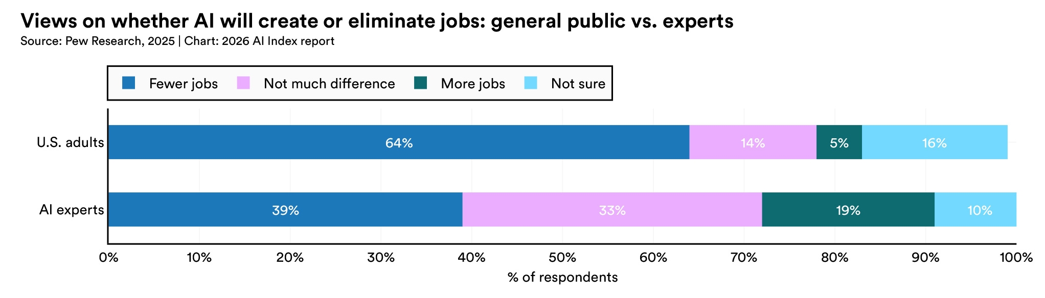Experts were less pessimistic (39% fewer, 19% more) but forecast far faster adoption, expecting generative AI to assist 18% of U.S. work hours by 2030 versus the public's estimate of 10%.