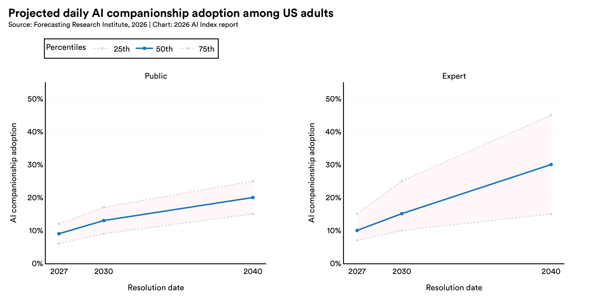 More than half of respondents worldwide (52%) reported some excitement about using AI for companionship, compared with just 42% in the United States. Experts forecast that 10% of U.S. adults will use an AI companion daily by 2027, rising to 30% by 2040.