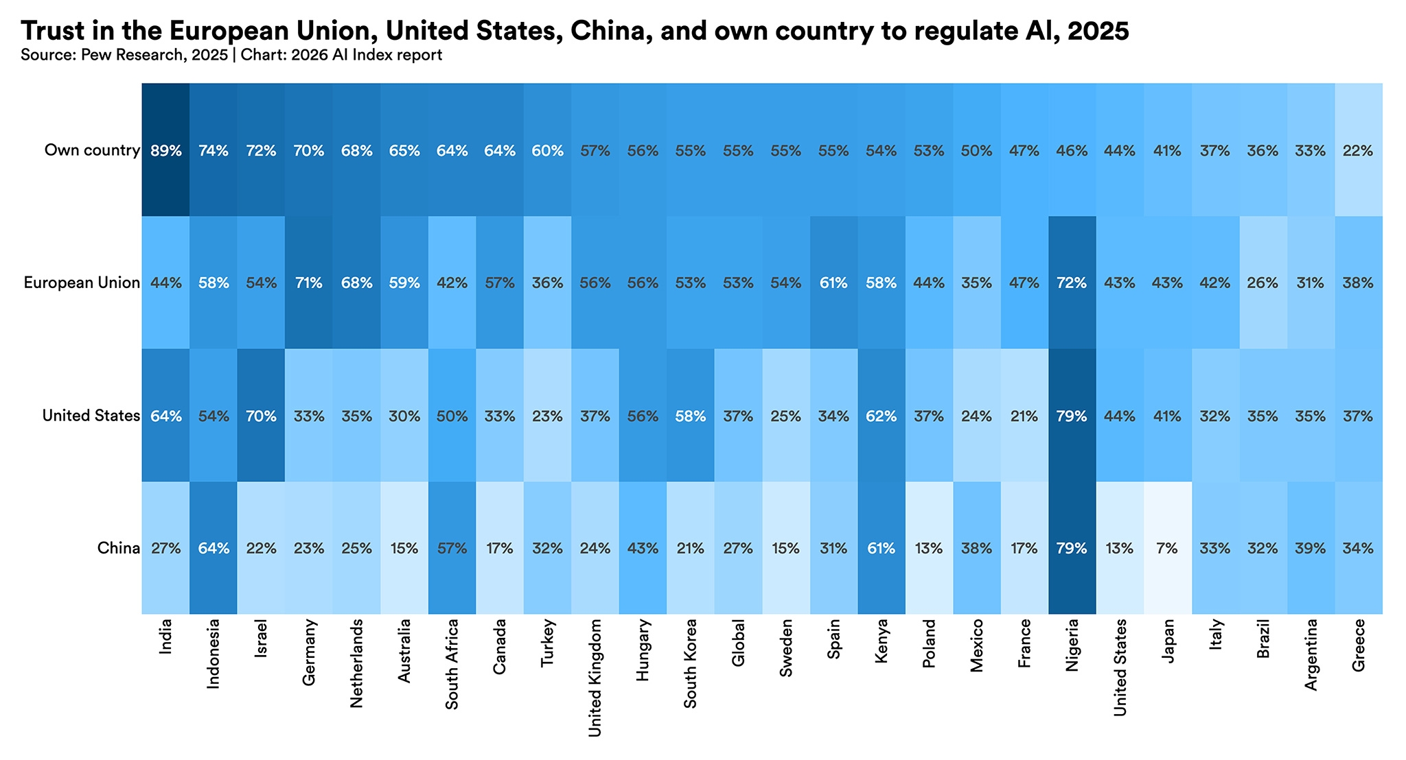 Across 25 countries in Pew's 2025 survey, a median of 53% said they trust the EU, compared to 37% for the United States and 27% for China.