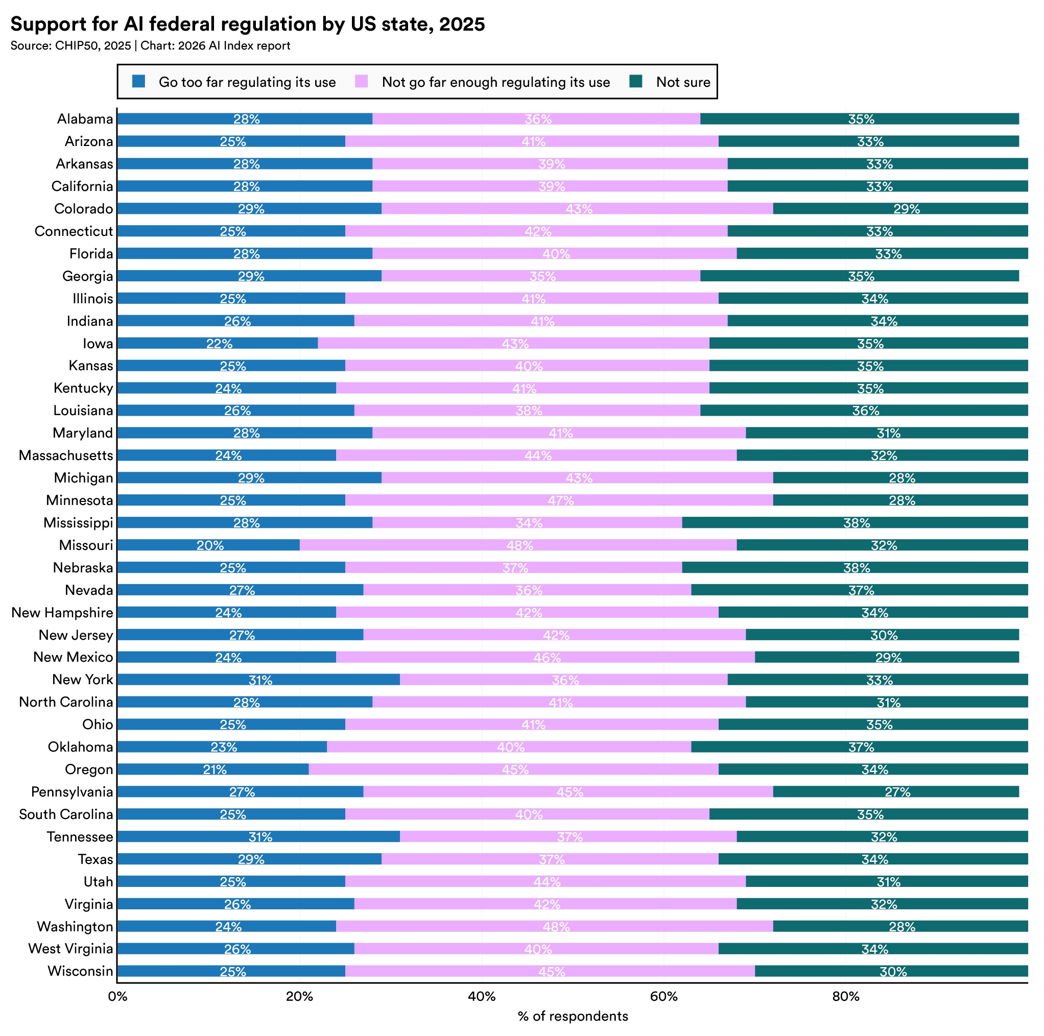 Nationally, 41% of respondents said federal AI regulation will not go far enough, compared with 27% who said it will go too far, though more than one-third were unsure.