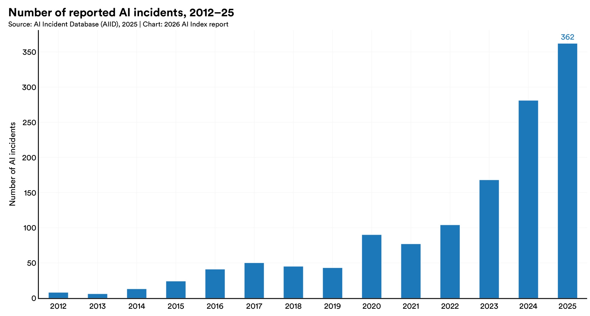 Almost all leading frontier model developers report results on capability benchmarks like MMLU and SWE-bench, but reporting on responsible AI benchmarks remains sparse. Documented AI incidents continued to rise, with the AI Incident Database recording 362 in 2025, up from 233 in 2024.