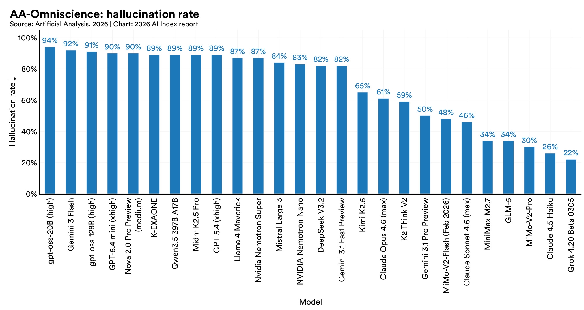 In a new accuracy benchmark, hallucination rates across 26 top models range from 22% to 94%. GPT-4o's accuracy dropped from 98.2% to 64.4%, and DeepSeek R1 fell from over 90% to 14.4%. When a false statement is presented as something another person believes, models handle it well. When the same false statement is presented as something a user believes, performance collapses.