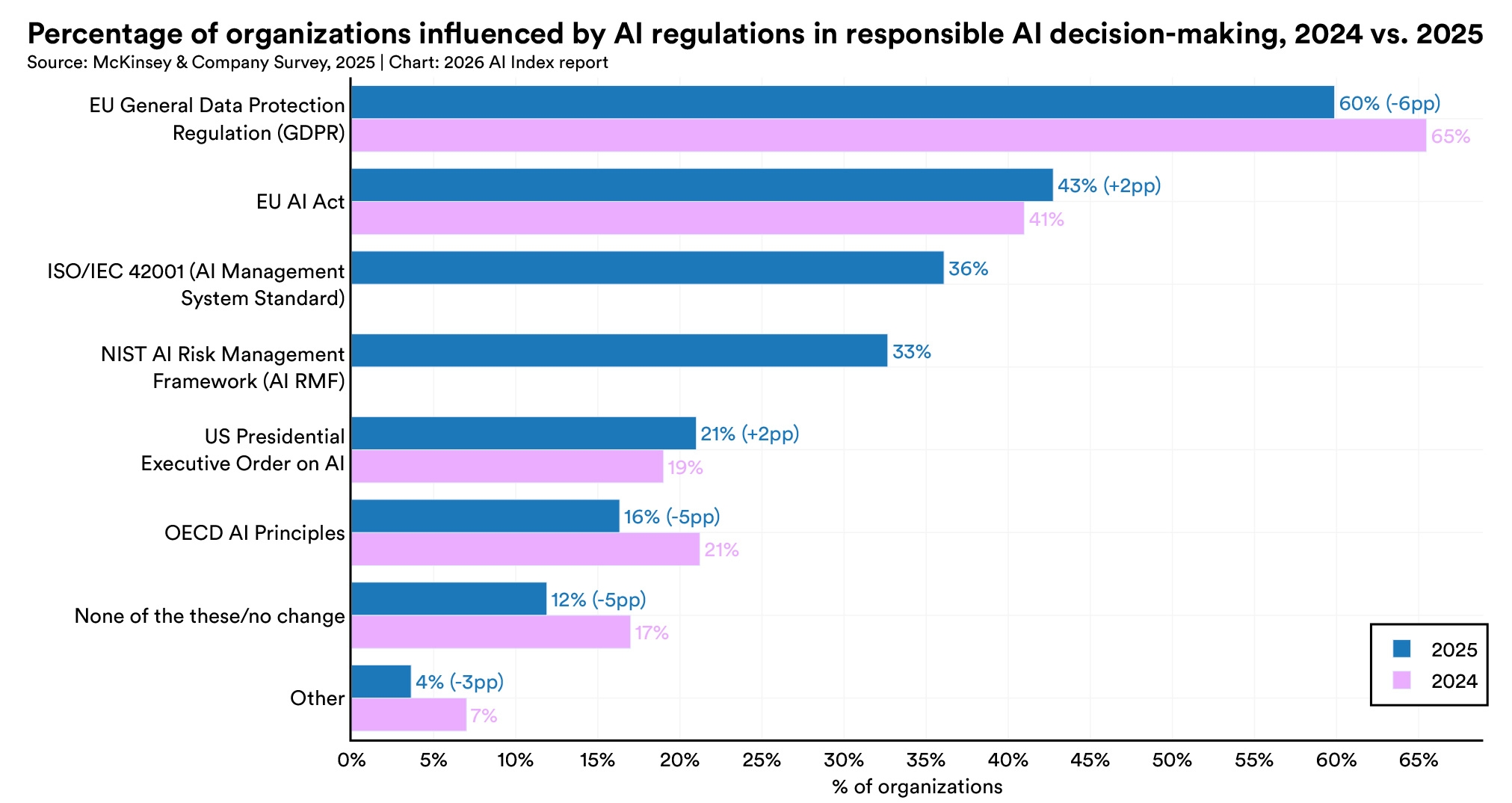 GDPR remains the most cited regulatory influence but slipped from 65% in 2024 to 60% in 2025. New entries in 2025 include ISO/IEC 42001, an AI management system standard, cited by 36% of respondents, and the NIST AI Risk Management Framework at 33%. The share of organizations reporting no regulatory influence at all fell from 17% to 12%.