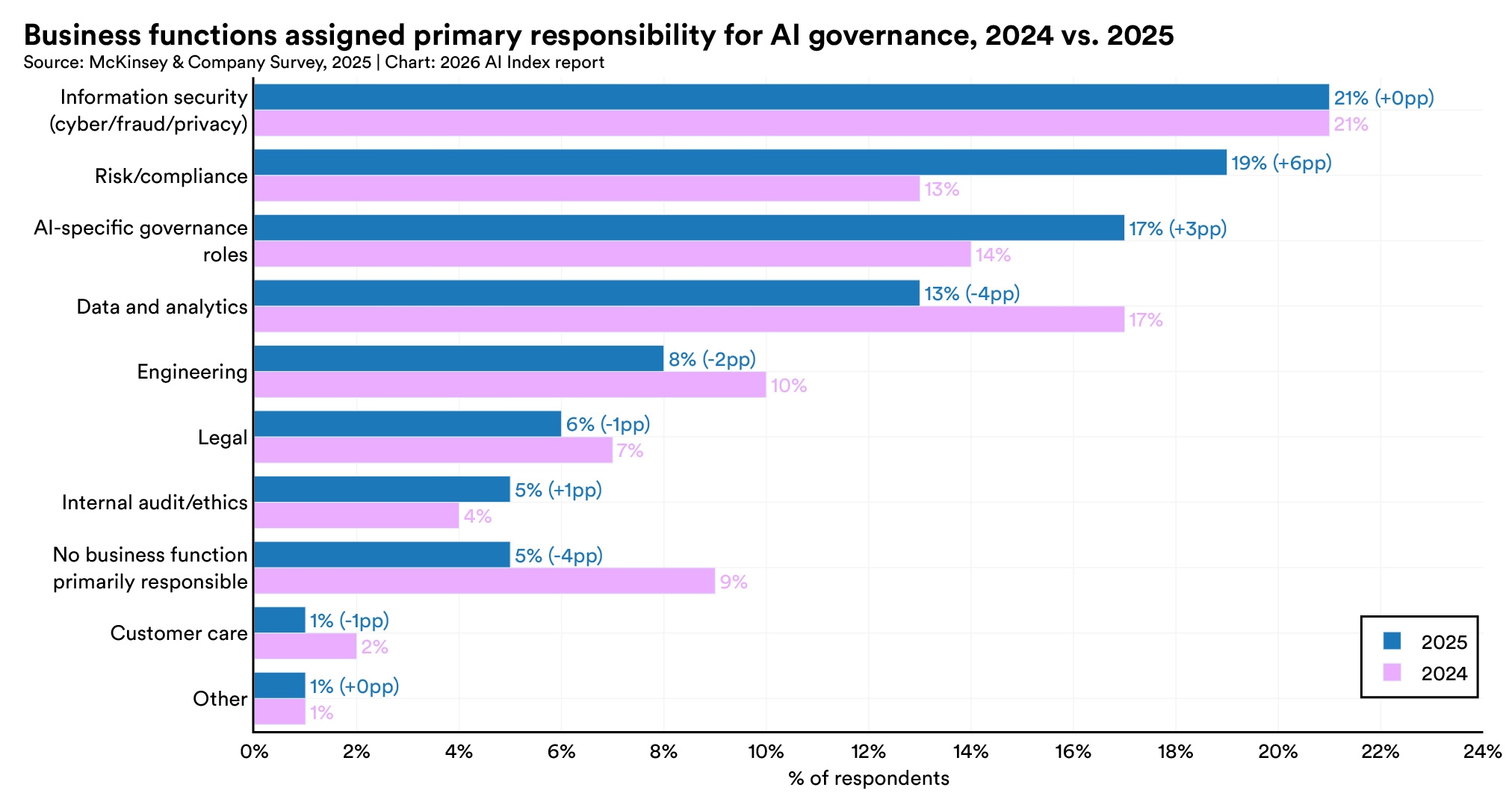 AI-specific governance roles grew 17% in 2025, and the share of businesses with no responsible AI policies in place fell sharply from 24% to 11%. The main obstacles to implementation remain gaps in knowledge (59%), budget constraints (48%), and regulatory uncertainty (41%).