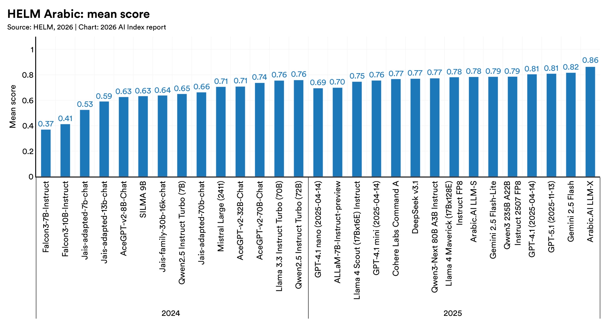 On HELM Arabic, a regionally developed model for the Arabic language, outscored GPT-5.1 and Gemini 2.5 Flash. The gap widens at the dialect level. On a Slovenian commonsense reasoning test, several leading models lost close to half their accuracy when tested in a regional dialect rather than the standard language.