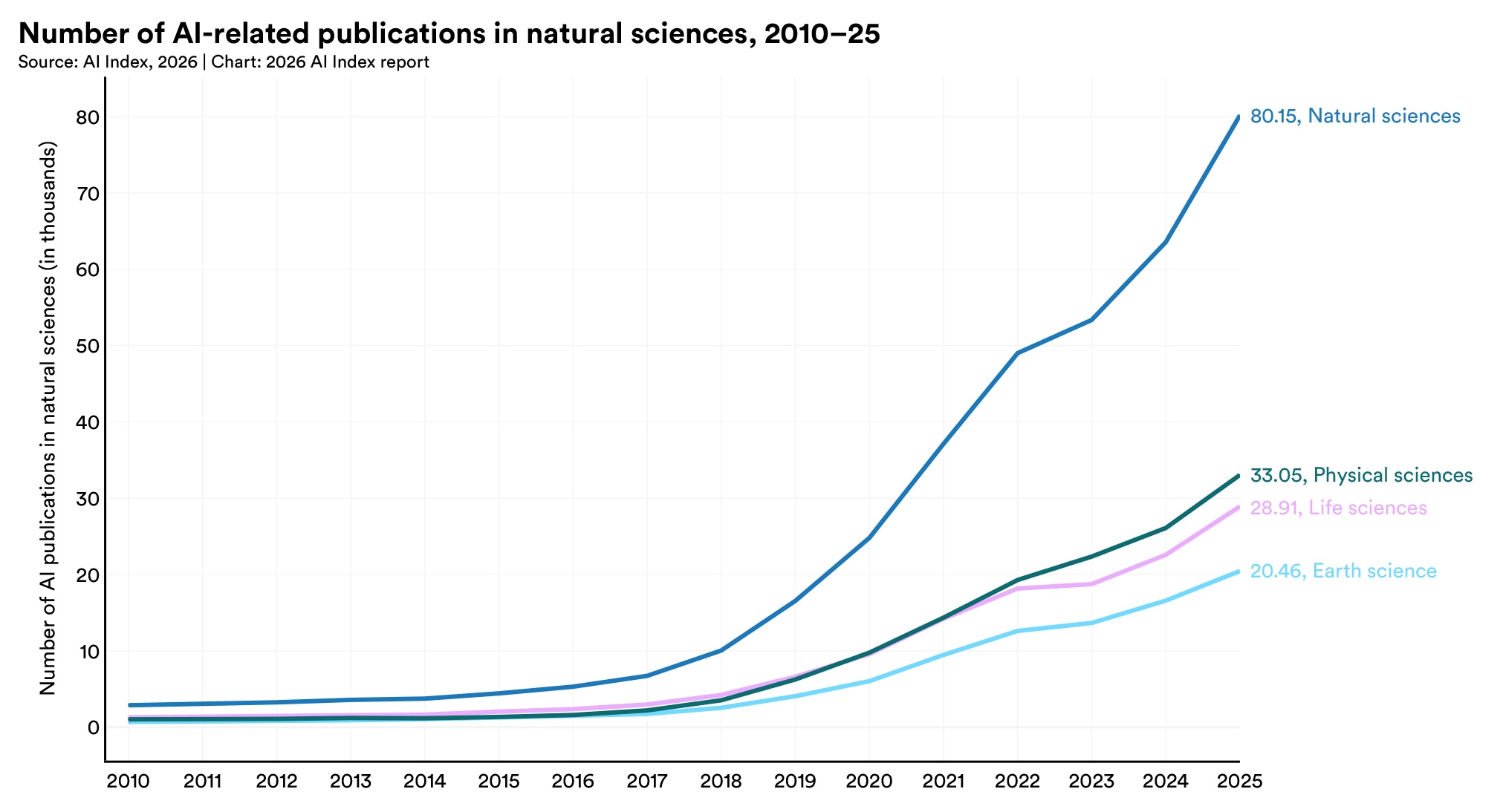 Natural sciences reached approximately 80,150 AI publications in 2025, up 26% from 2024. AI now accounts for 5.8%–8.8% of scientific research output depending on the field, up from below 1% in 2010.