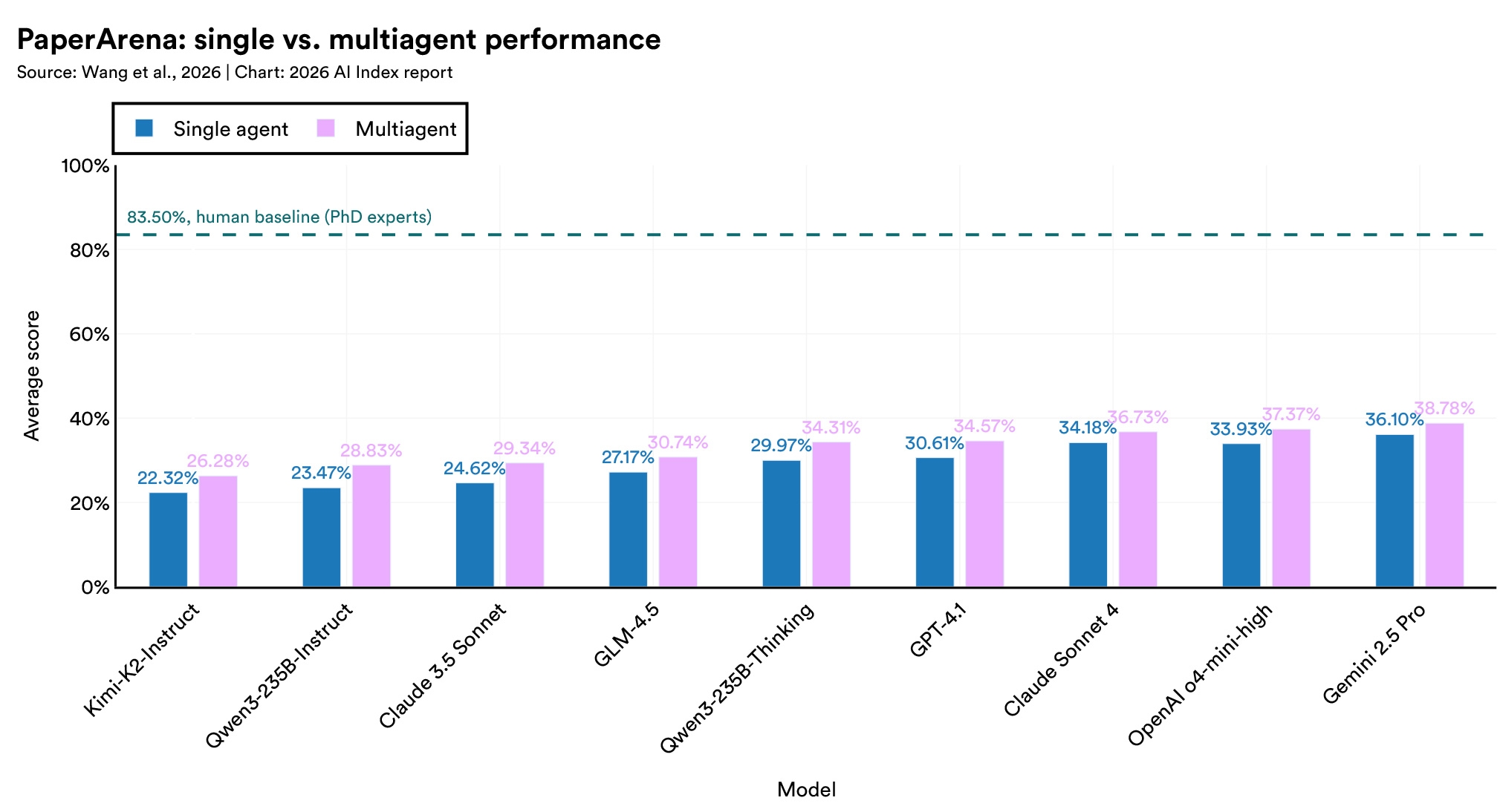 On PaperArena, the best agent reaches 38.8% accuracy versus a PhD expert baseline of 83.5%. On BixBench, frontier models achieve roughly 17% accuracy on real-world bioinformatics analysis.