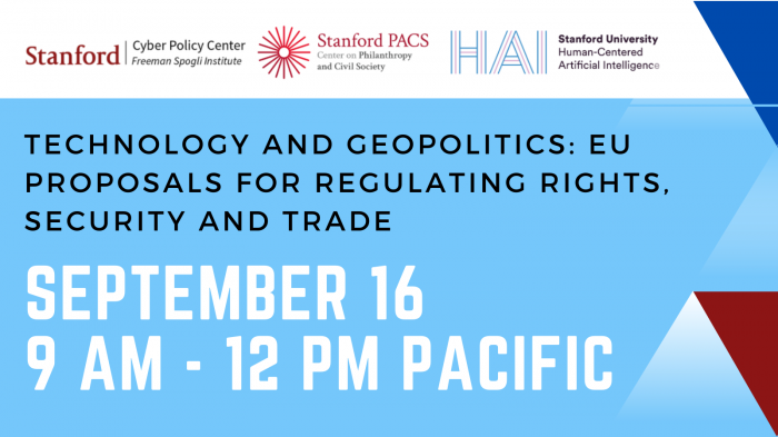The future of technology policy in Europe will be affected by growing nationalism and protectionism, cyber and national security threats, and great power rivalries. The aim of these workshops is to develop a more precise understanding of how the EU and its allies can collaborate to create compatible technology standards, build more resilient supply chain, and address novel opportunities and risks presented by emerging technologies.Join us on Sep. 16th from 9 am - 12 pm PST, for a webinar on EU legislative packages, digital trade rules, and cybersecurity & geopolitics. Our International Policy Director, Marietje Schaake, will introduce and moderate the event. We're currently finalising our exciting line-up of speakers and look forward to unveiling the final list shortly.This event is organized by the Program on Democracy and the Internet (part of the Cyber Policy Center and the Center on Philanthropy and Civil Society) and co-sponsored by the Institute for Human-Centered Artificial Intelligence.
