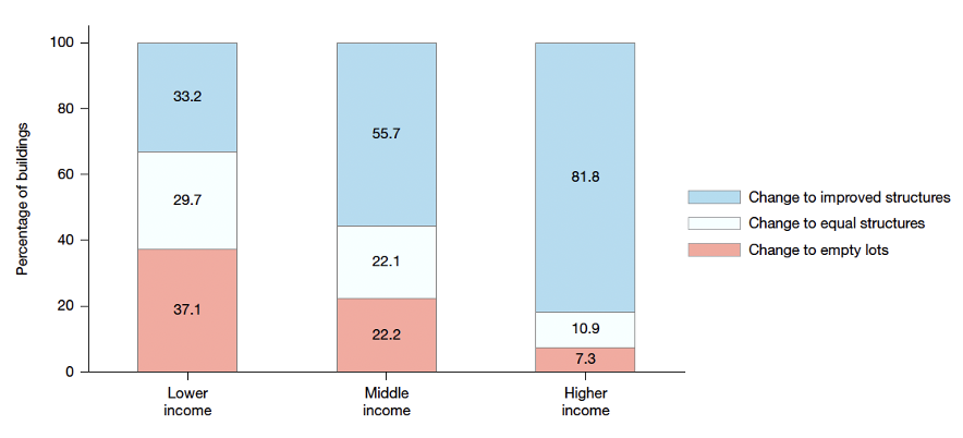 The researchers found distinct differences in rebuild rates for census tracts with different median income levels (low, medium, high). In lower-income areas, more than 37% of buildings that were damaged and then became empty lots after a disaster remained empty lots for years afterward, while only 22% and 7% did so in medium and high-income areas. Conversely, nearly 82% of damaged buildings changed to improved structures in high income census tracts, compared with 56% and 33% in medium and low-income tracts.